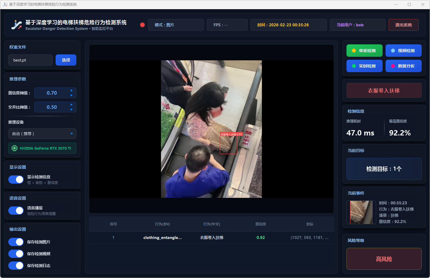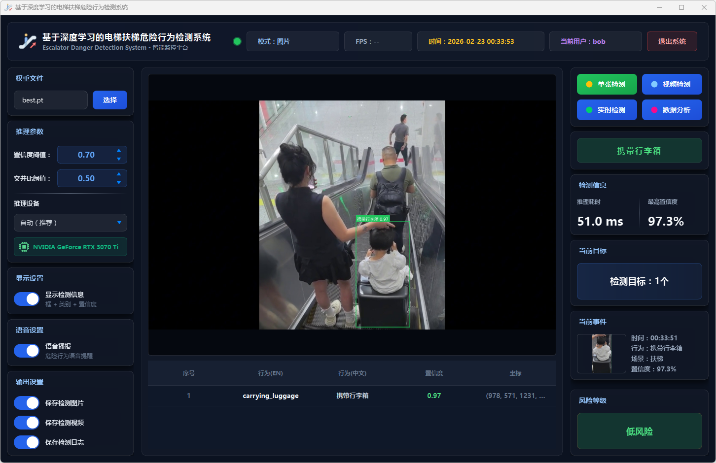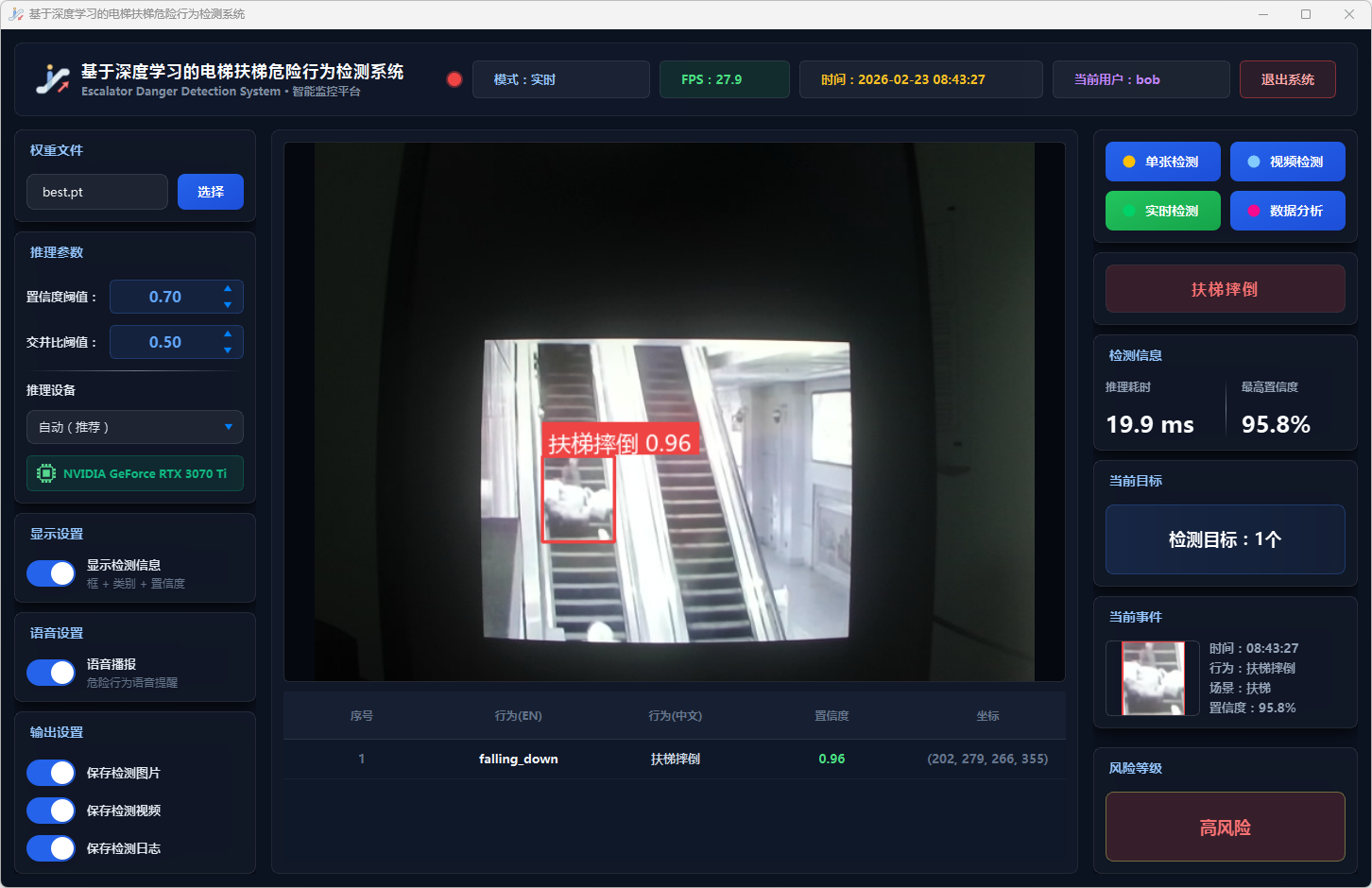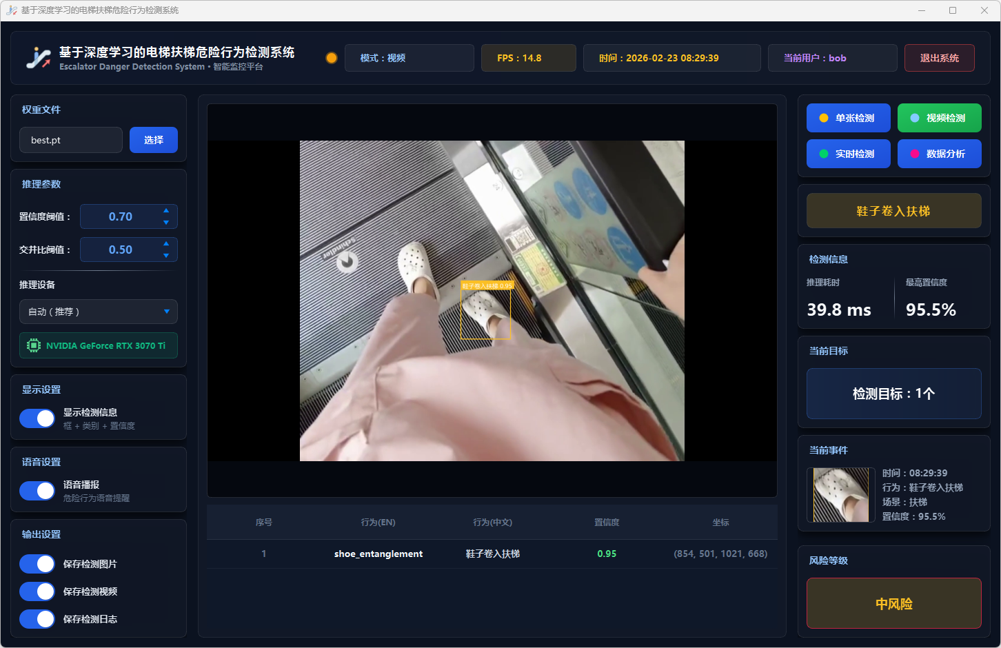 实验结果表明,本系统能够准确、实时地检测多种扶梯危险行为,风险分级预警机制合理有效,语音报警响应及时,数据分析功能为安全管理提供了可靠的数据支撑。该系统可部署于地铁站、商场等公共场所,辅助安保人员进行扶梯安全监控,具有良好的实际应用价值和推广前景。