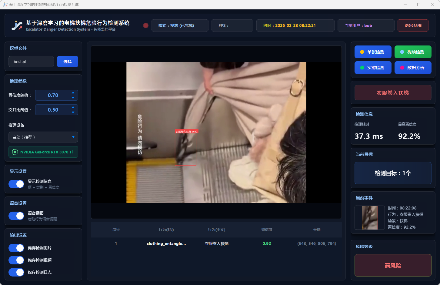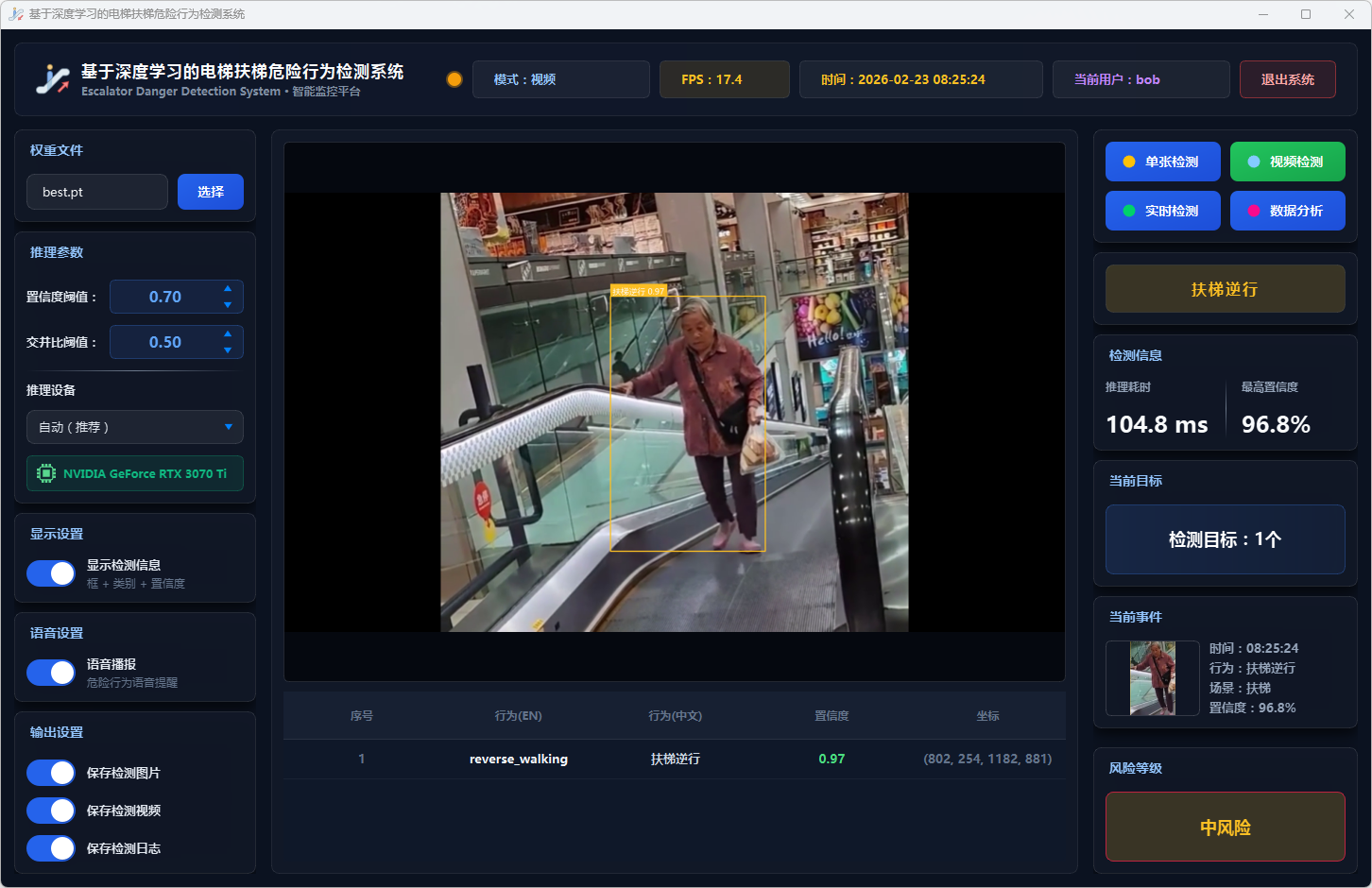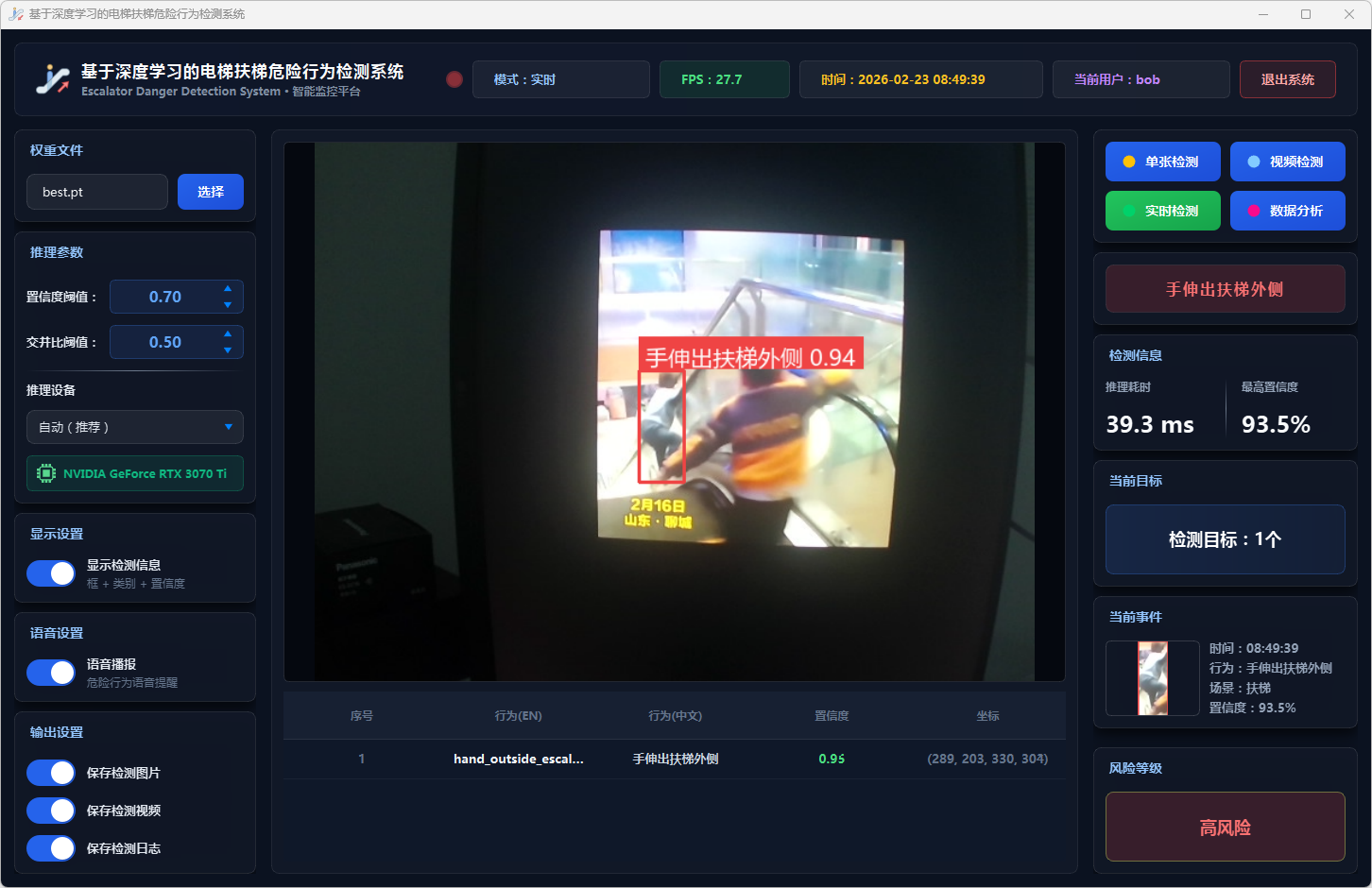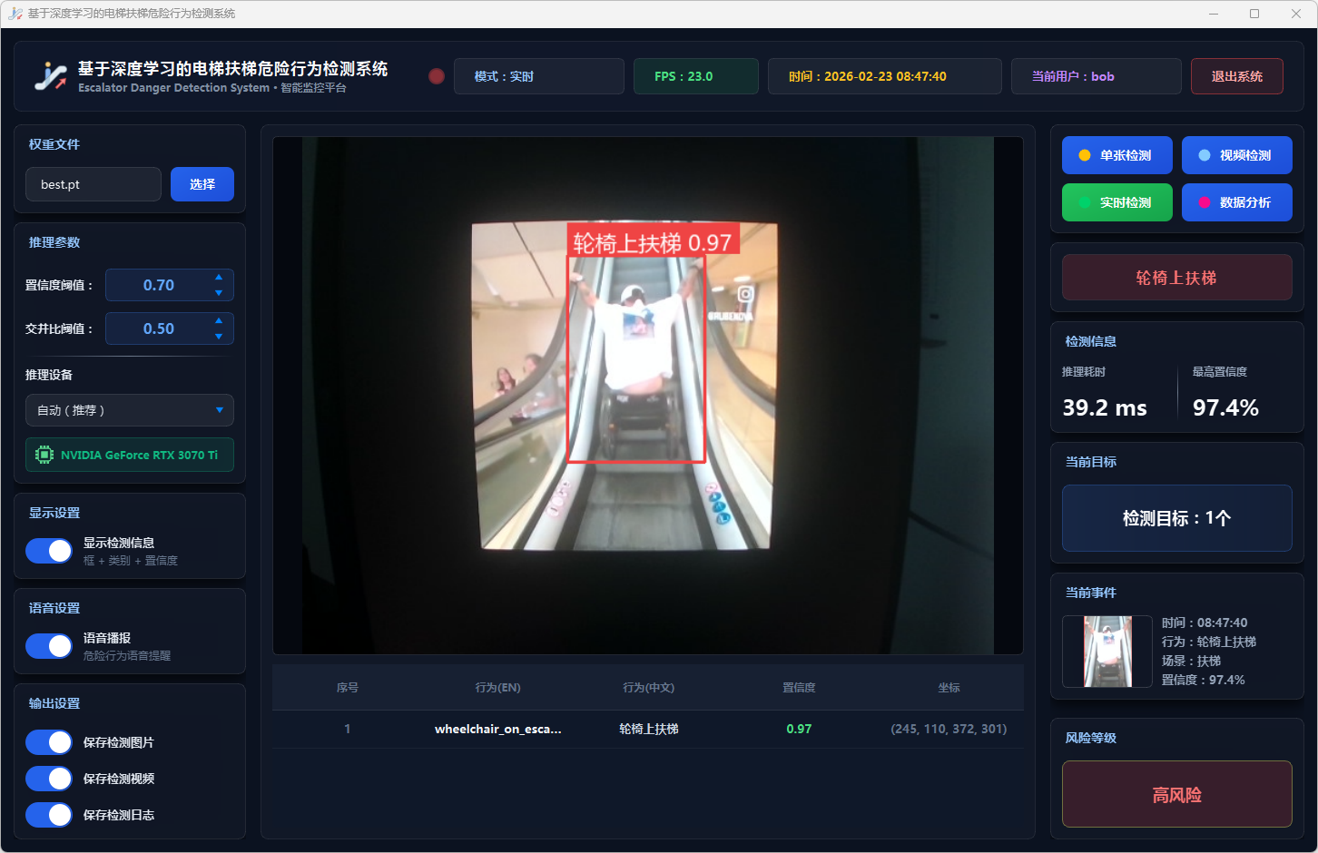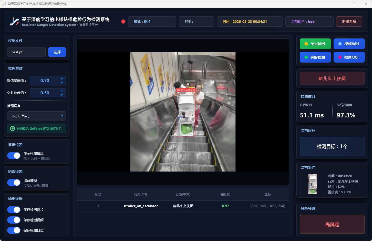实验结果表明,本系统能够准确、实时地检测多种扶梯危险行为,风险分级预警机制合理有效,语音报警响应及时,数据分析功能为安全管理提供了可靠的数据支撑。该系统可部署于地铁站、商场等公共场所,辅助安保人员进行扶梯安全监控,具有良好的实际应用价值和推广前景。