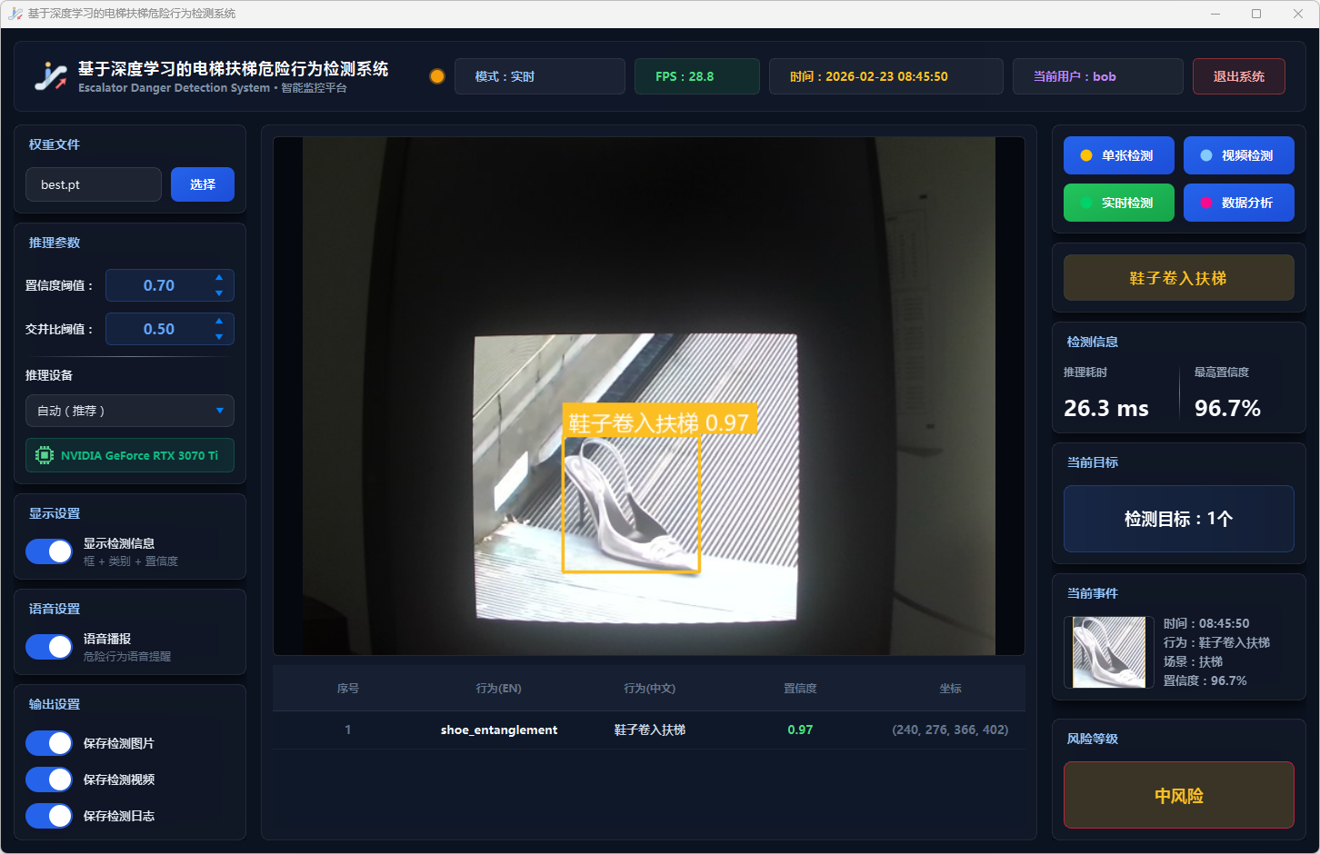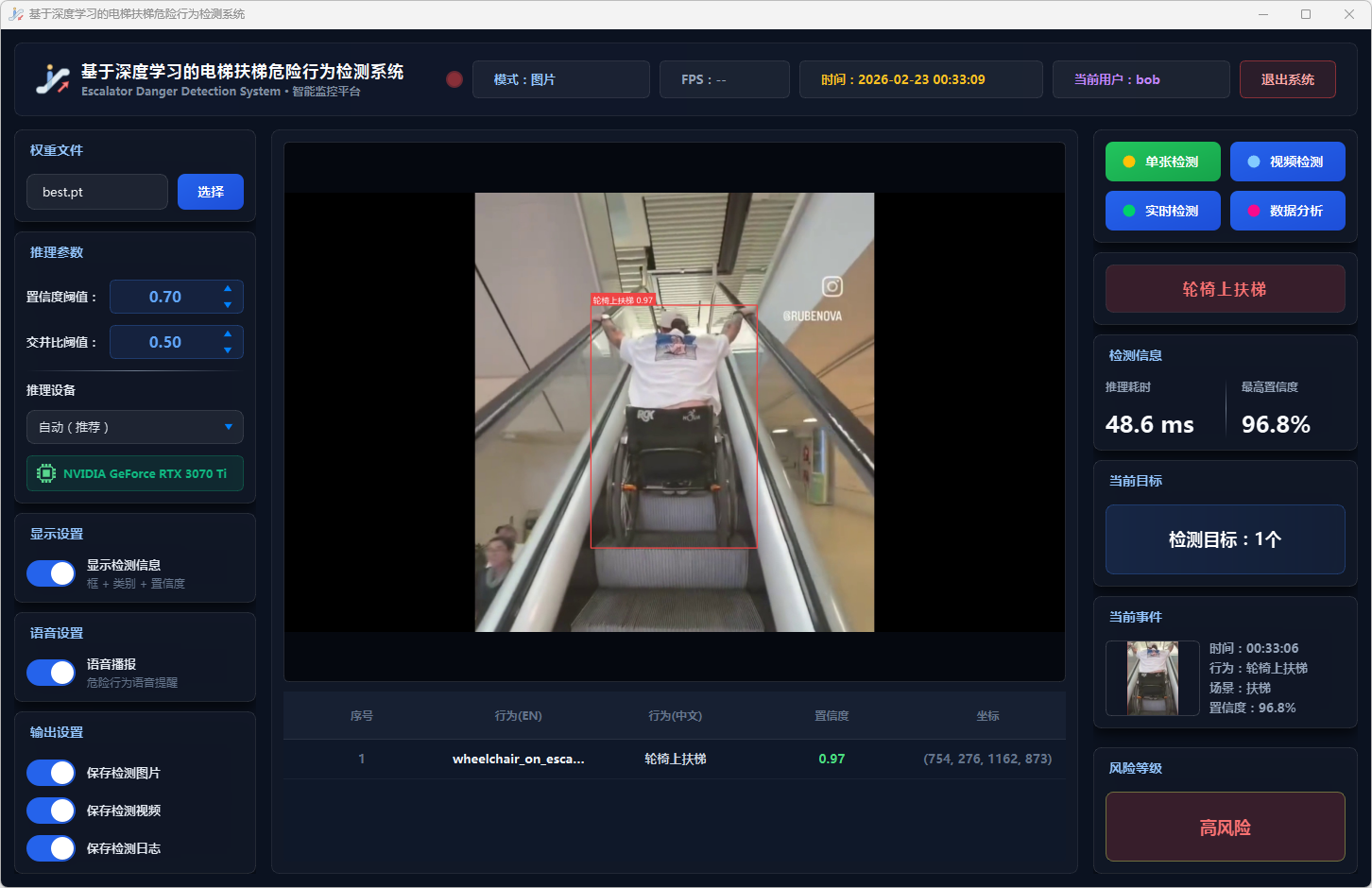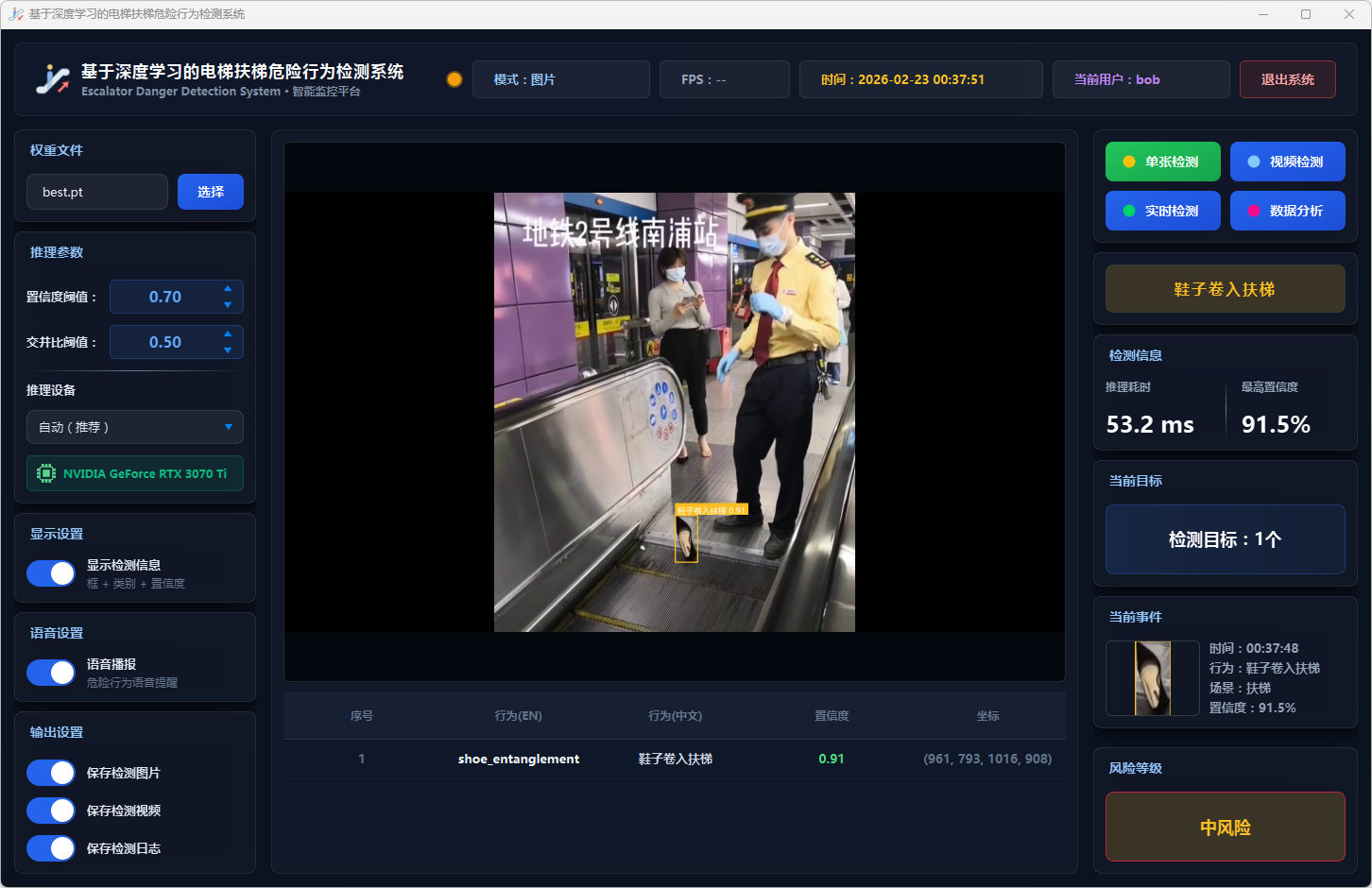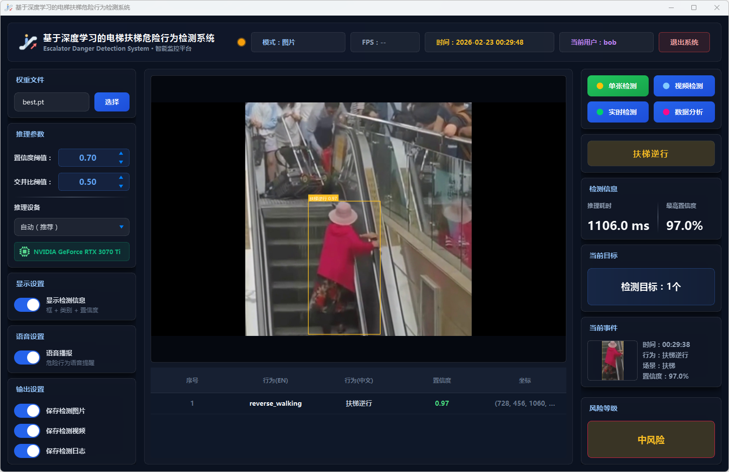实验结果表明,本系统能够准确、实时地检测多种扶梯危险行为,风险分级预警机制合理有效,语音报警响应及时,数据分析功能为安全管理提供了可靠的数据支撑。该系统可部署于地铁站、商场等公共场所,辅助安保人员进行扶梯安全监控,具有良好的实际应用价值和推广前景。