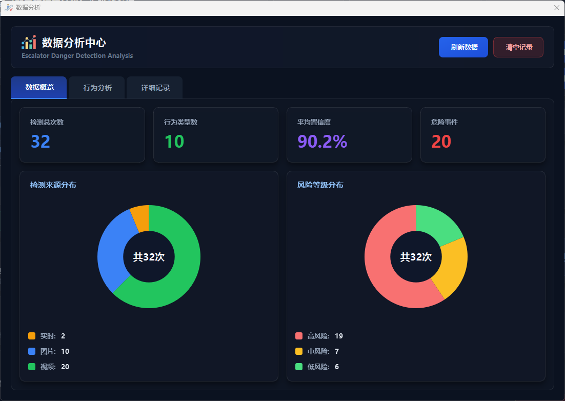 数据分析模块提供检测数据的可视化展示和统计分析功能,用户点击"数据分析"按钮打开独立的分析窗口,包含数据概览、行为分析、详细记录三个标签页,可查看检测总数、行为类型数、平均置信度、危险事件数等关键指标,通过条形图展示十类危险行为分布、饼图展示检测来源(图片/视频/实时)和风险等级(低风险/中风险/高风险)分布,支持查询最近50条历史检测记录(存储在SQLite数据库data/app.db)、清空当前用户记录等操作,实现检测数据的持久化存储和全面分析。