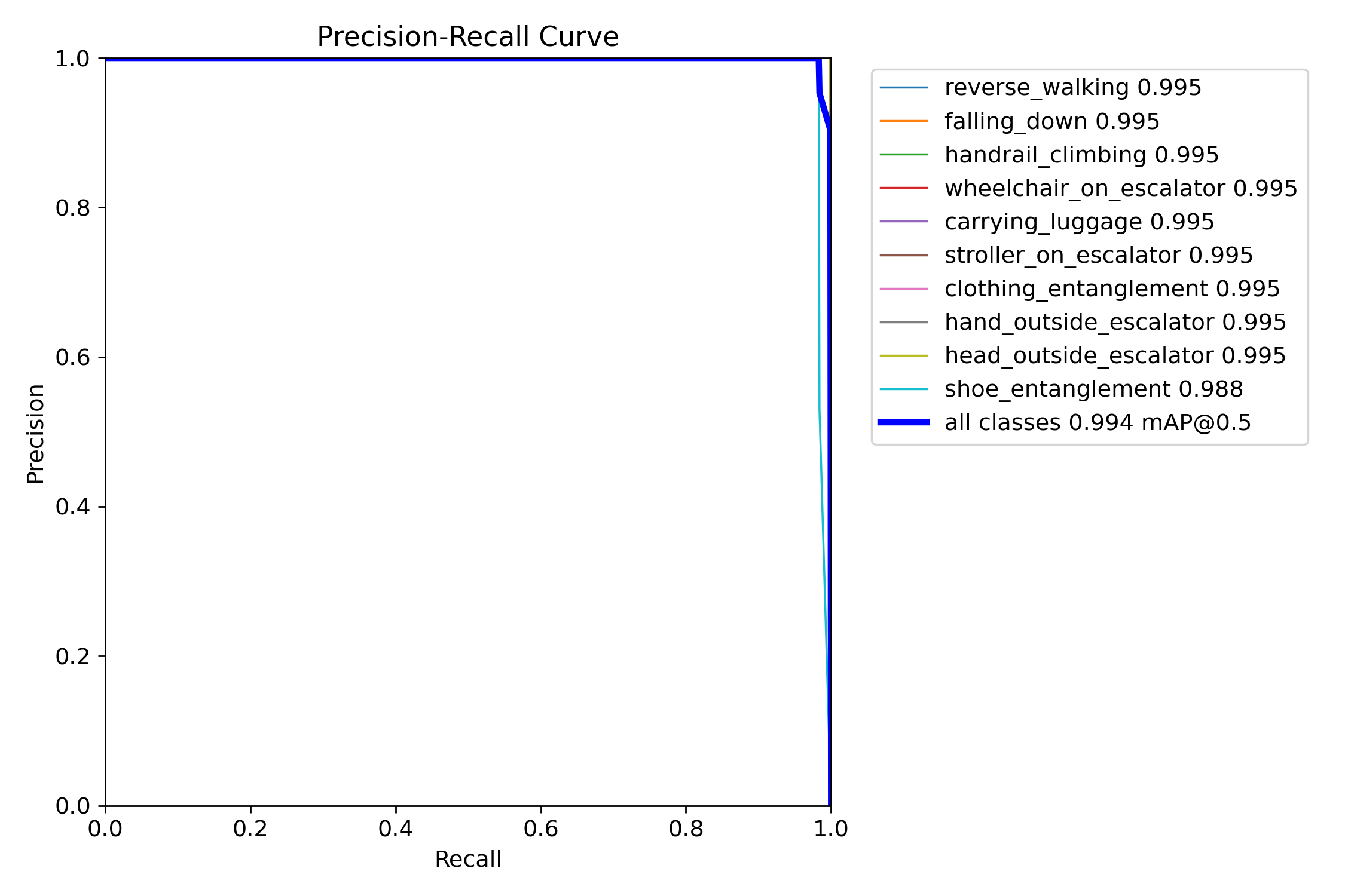 该曲线展示了模型在电梯扶梯危险行为检测任务上的学习能力和收敛特性,验证了训练策略的有效性。最终95.96% mAP@0.5:0.95配合99.4% mAP@0.5,表明模型在严格评估标准下仍保持优异性能。