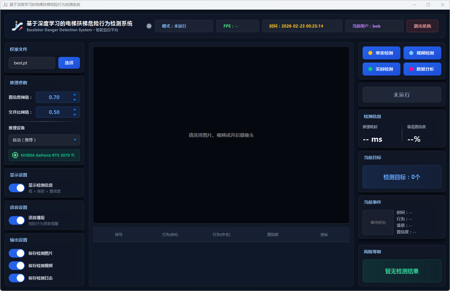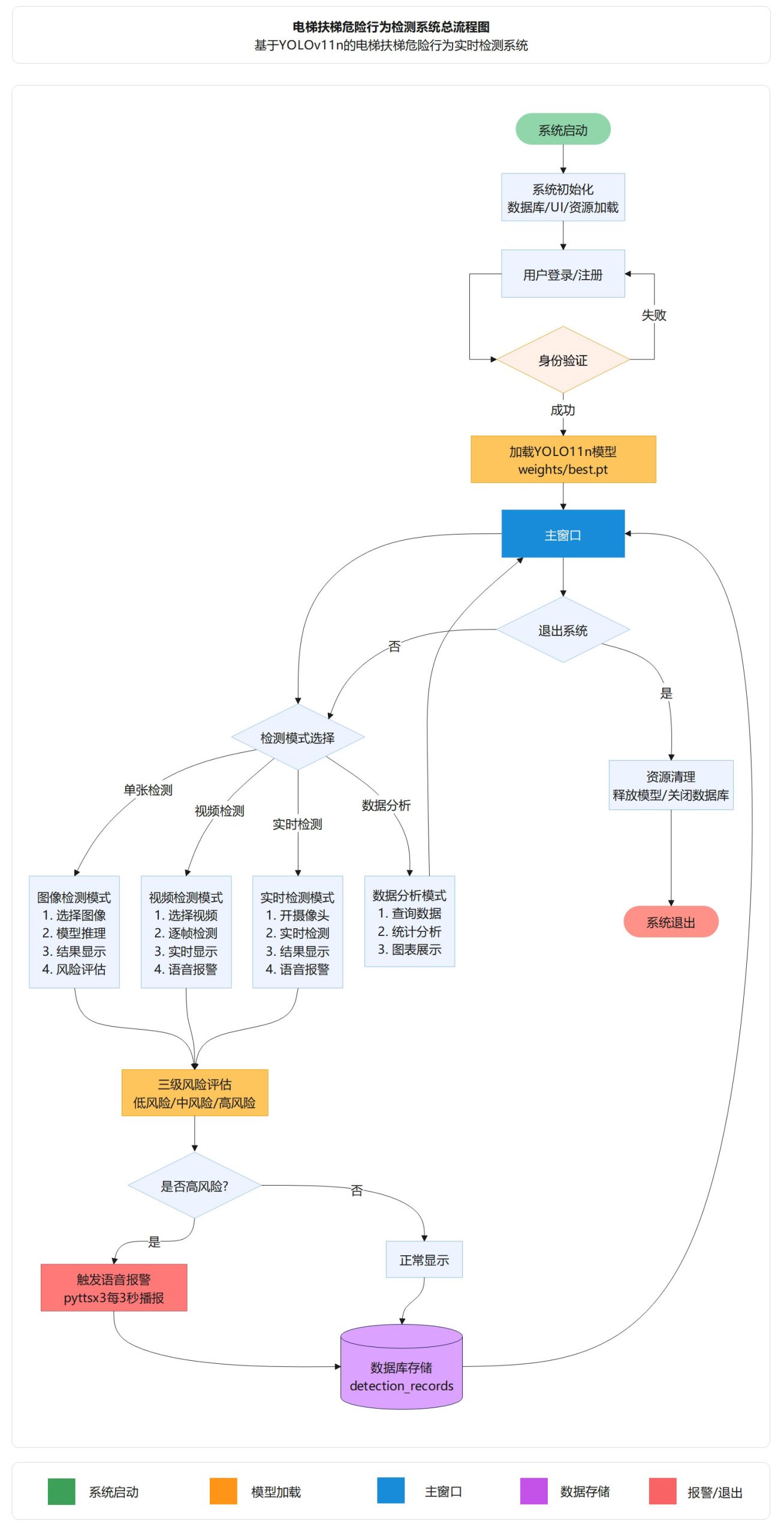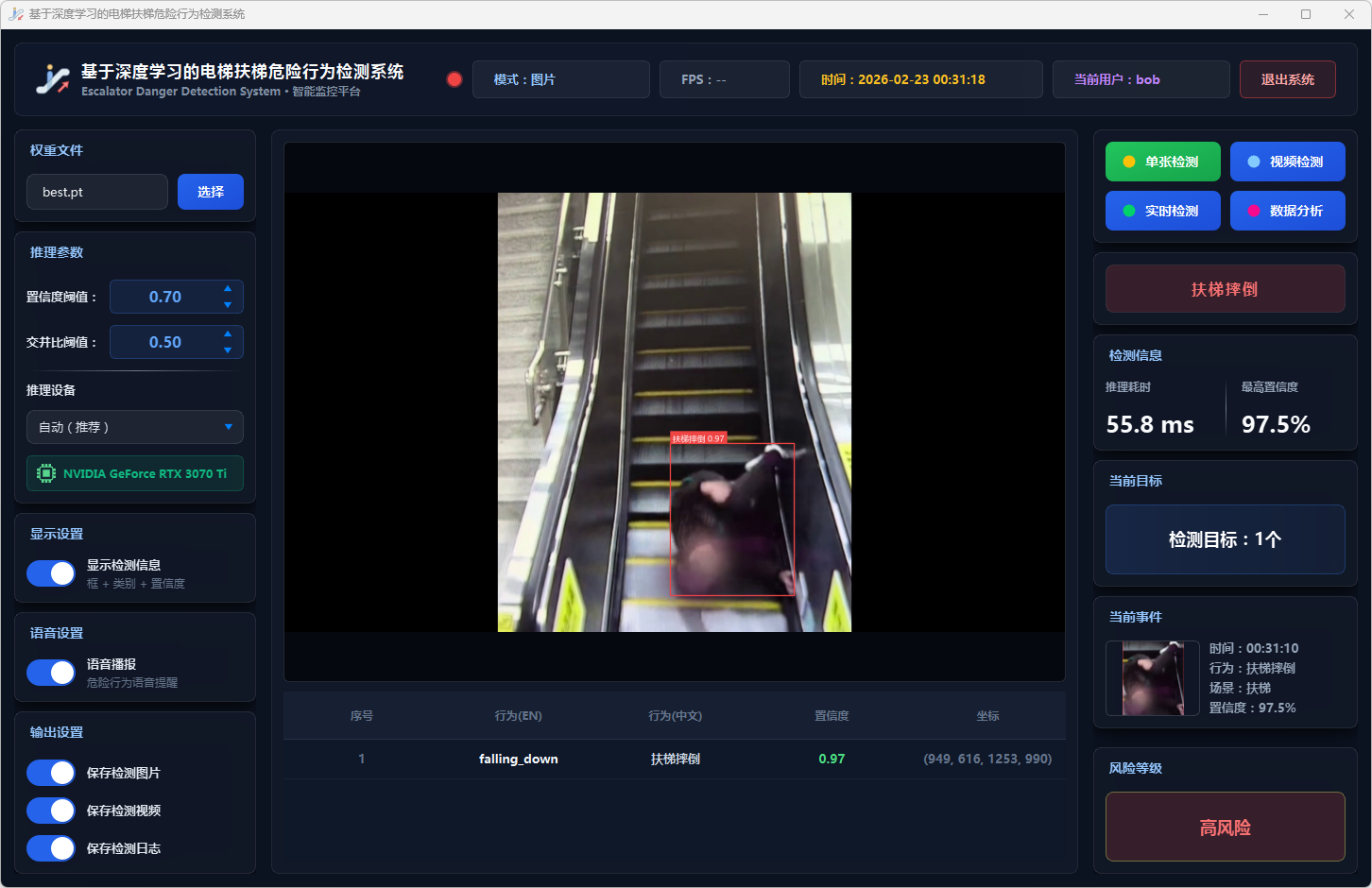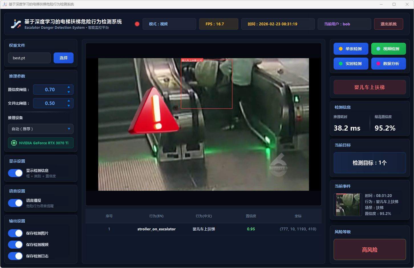 摄像头检测模式支持连接本地摄像头进行实时扶梯危险行为检测,用户点击"摄像头检测"按钮后,系统启动DetectWorker线程打开本地摄像头进行实时视频流检测,实时显示检测结果、行为类别和置信度,当连续3帧稳定检测到高风险行为(扶梯摔倒、攀爬扶手、轮椅上扶梯、婴儿车上扶梯、衣服卷入扶梯、手伸出扶梯外侧)时自动触发pyttsx3语音持续报警(每3秒播报),界面实时更新风险等级指示和检测统计信息,检测记录自动保存到数据库。