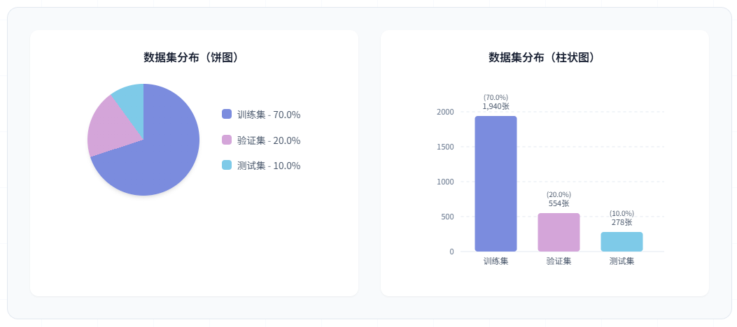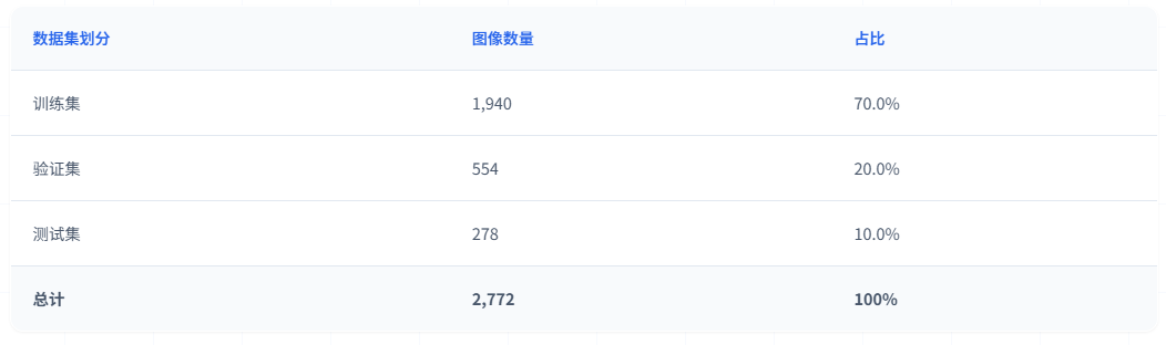 训练集用于模型的参数学习和特征提取能力训练。验证集用于训练过程中的性能监控和超参数调优,帮助选择最优模型。测试集用于最终的性能评估,确保模型在未见过的数据上具有良好的泛化能力。