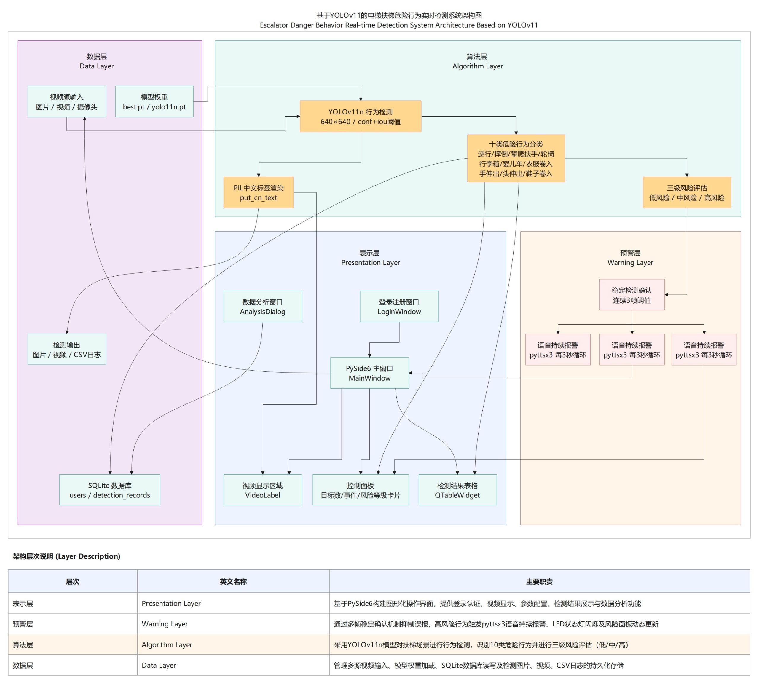 本系统基于YOLO11n深度学习模型,实现了电梯扶梯场景下十类危险行为的智能检测与预警。系统采用PySide6构建图形用户界面,提供图片检测、视频检测、实时摄像头检测三种工作模式,并集成了三级风险评估、语音持续报警、数据统计分析、检测记录管理等功能,为电梯扶梯安全监控提供高效、可靠的技术支撑。