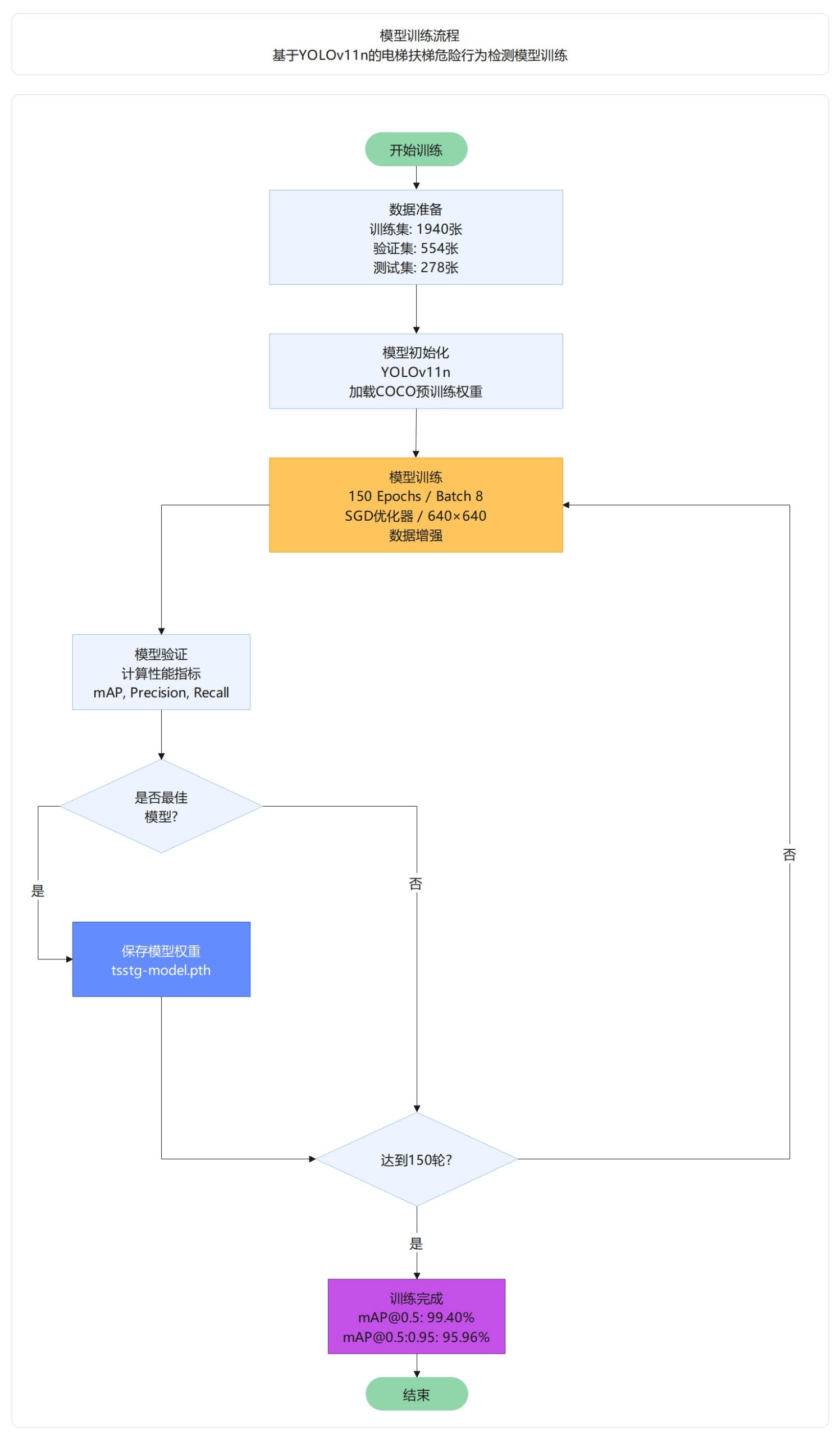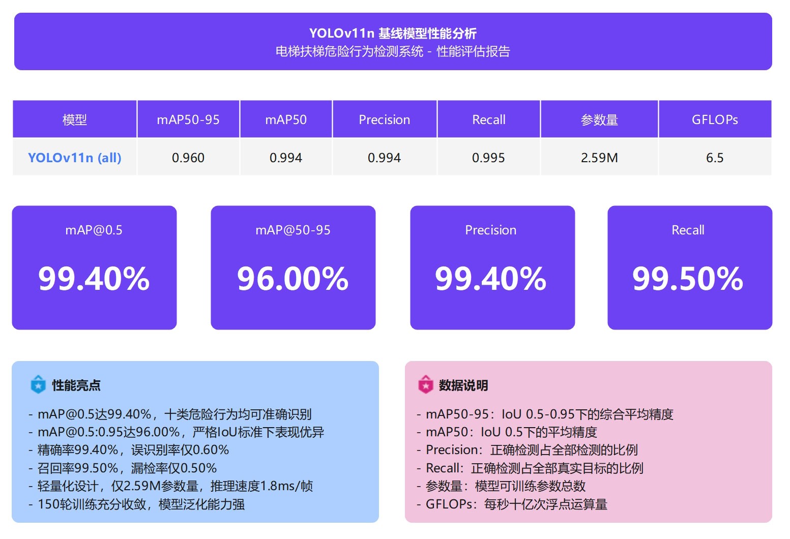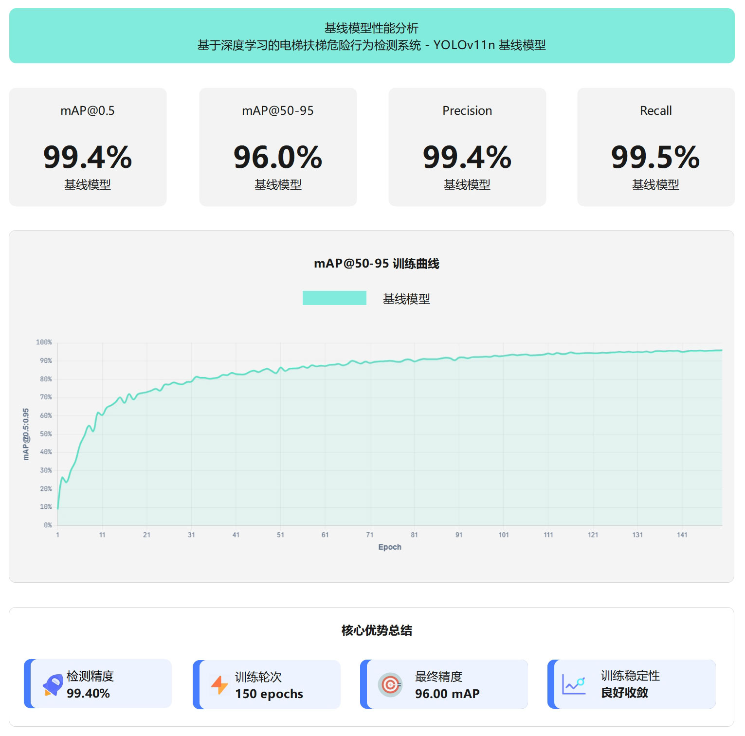 YOLO11n基线模型在电梯扶梯危险行为检测任务上展现出优异的综合性能,以2.59M参数量和6.5 GFLOPs的轻量化设计实现了99.4% mAP@0.5和95.96% mAP@0.5:0.95的检测精度,精确率达99.4%、召回率达99.5%,误识别率和漏检率均控制在1%以内。经过150轮充分训 练,模型在1,940张训练集和554张验证集上稳定收敛,mAP@0.5:0.95从初始的8.85%提升至95.96%,提升幅度达87.11%,验证了模型的 学习能力和泛化性能。该模型支持CPU/GPU多平台部署,推理速度达1.8ms/帧,适合实时视频流处理和边缘设备应用,为电梯扶梯危险 行为智能检测系统提供了高效、可靠、易部署的技术解决方案。