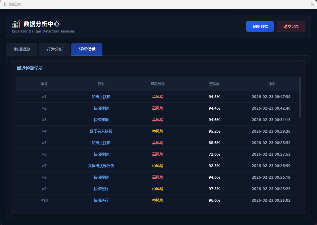 记录管理模块集成了检测结果的存储和查询功能,系统自动保存每次检测的行为类别、中文名称、置信度、风险等级、检测来源(图片/视频/摄像头)、检测时间等详细数据到SQLite数据库(data/app.db),用户可通过数据分析窗口的详细记录标签页查看最近50条历史记录,支持按用户隔离数据和清空记录操作,实现从检测到数据管理的全流程自动化处理。