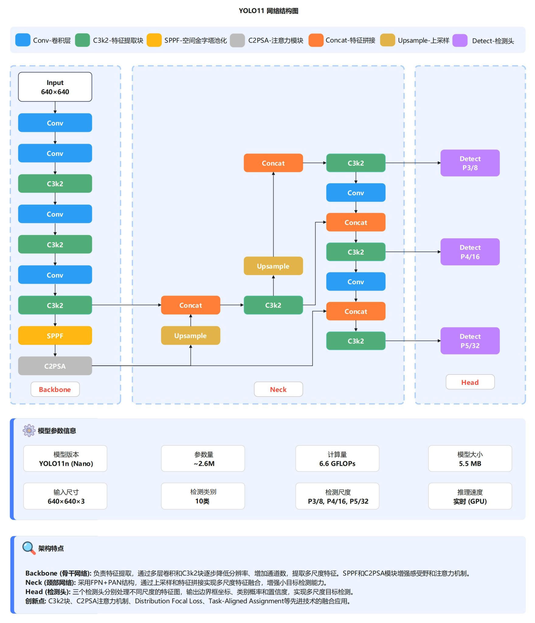 -- 轻量化设计:YOLOv11n模型仅2.6M参数,6.6 GFLOPs计算量,适合实际部署