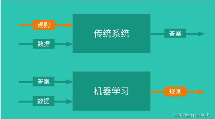 这张图很准确地描述了传统系统与机器学习之间的区别。简单来说,机器学习本身是一个黑盒子,我们不知道他具体里面都干了些什么,但是他总能从我们给的输入数据中找出数据之间的特征,生成一套规则,供我们使用。我们把中间这个"黑盒子"称为"神经网络"。