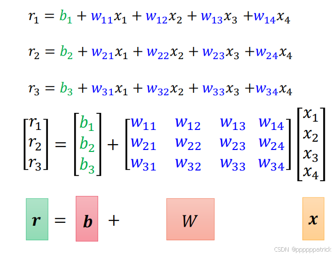 r = w ⋅ x + b = w 1 x 1 + w 2 x 2 + w 3 x 3 + b r = \boldsymbol{w} \cdot \boldsymbol{x} + b = w_1x_1 + w_2x_2 + w_3x_3 + b r=w⋅x+b=w1x1+w2x2+w3x3+b