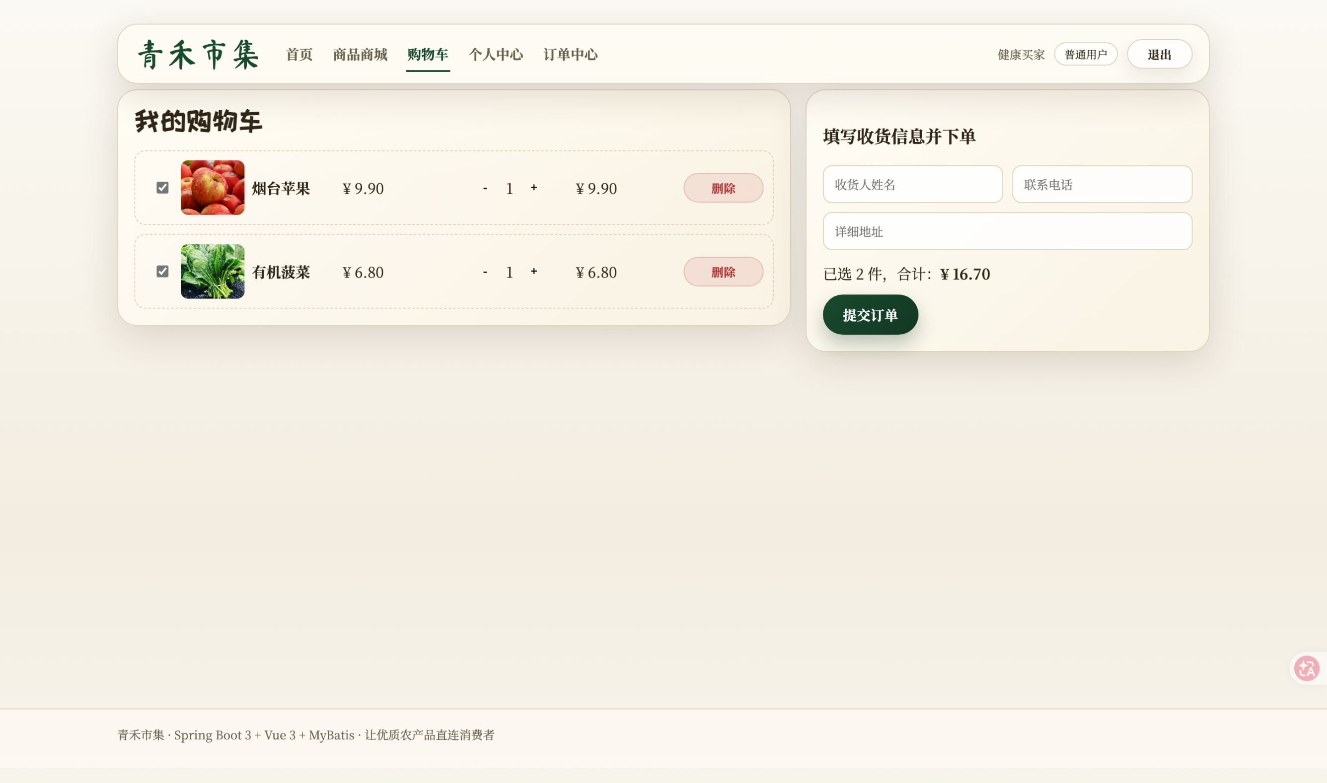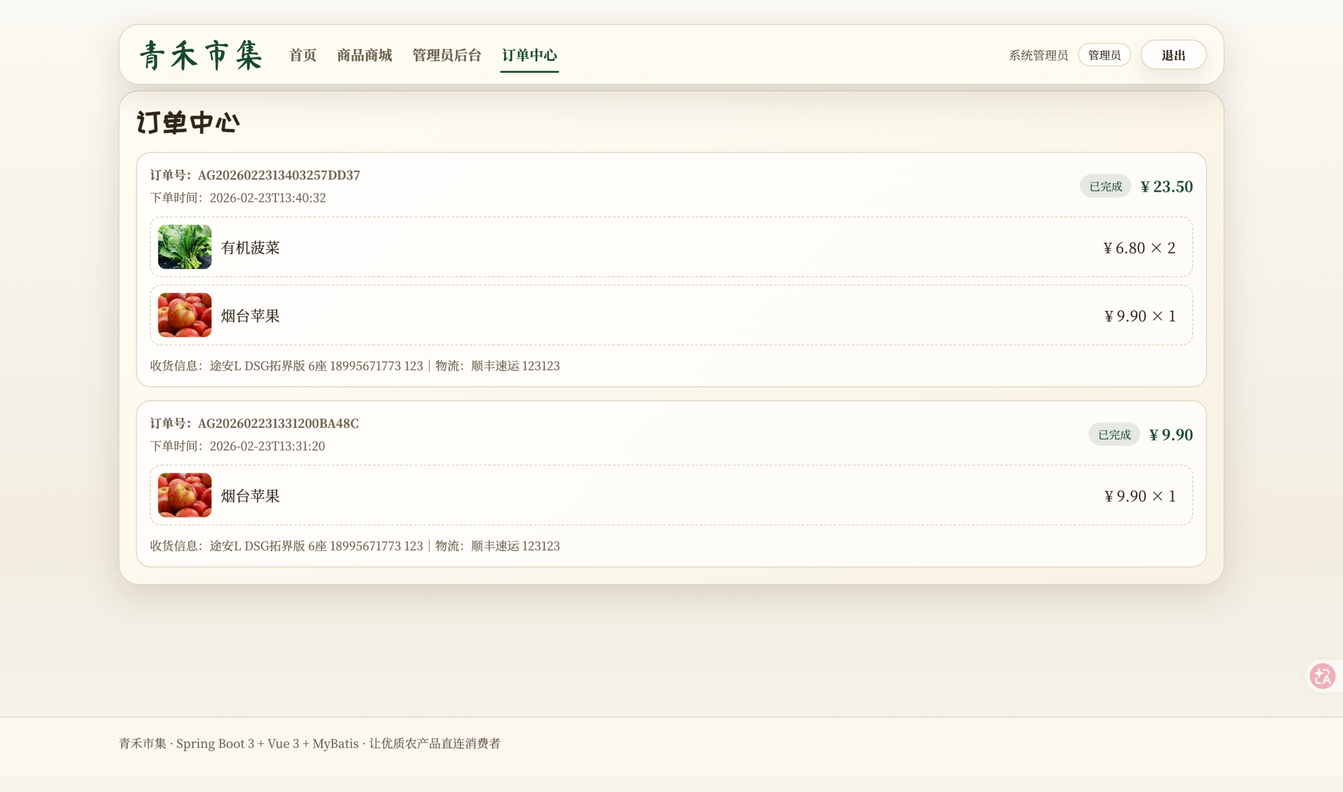 本文围绕农产品在线交易场景,完成了一个基于 Spring Boot 3 与 Vue 3 的前后端分离系统设计与实现。系统在角色协同、交易流程、内容治理和运营管理四个层面形成了完整闭环,主要成果如下: