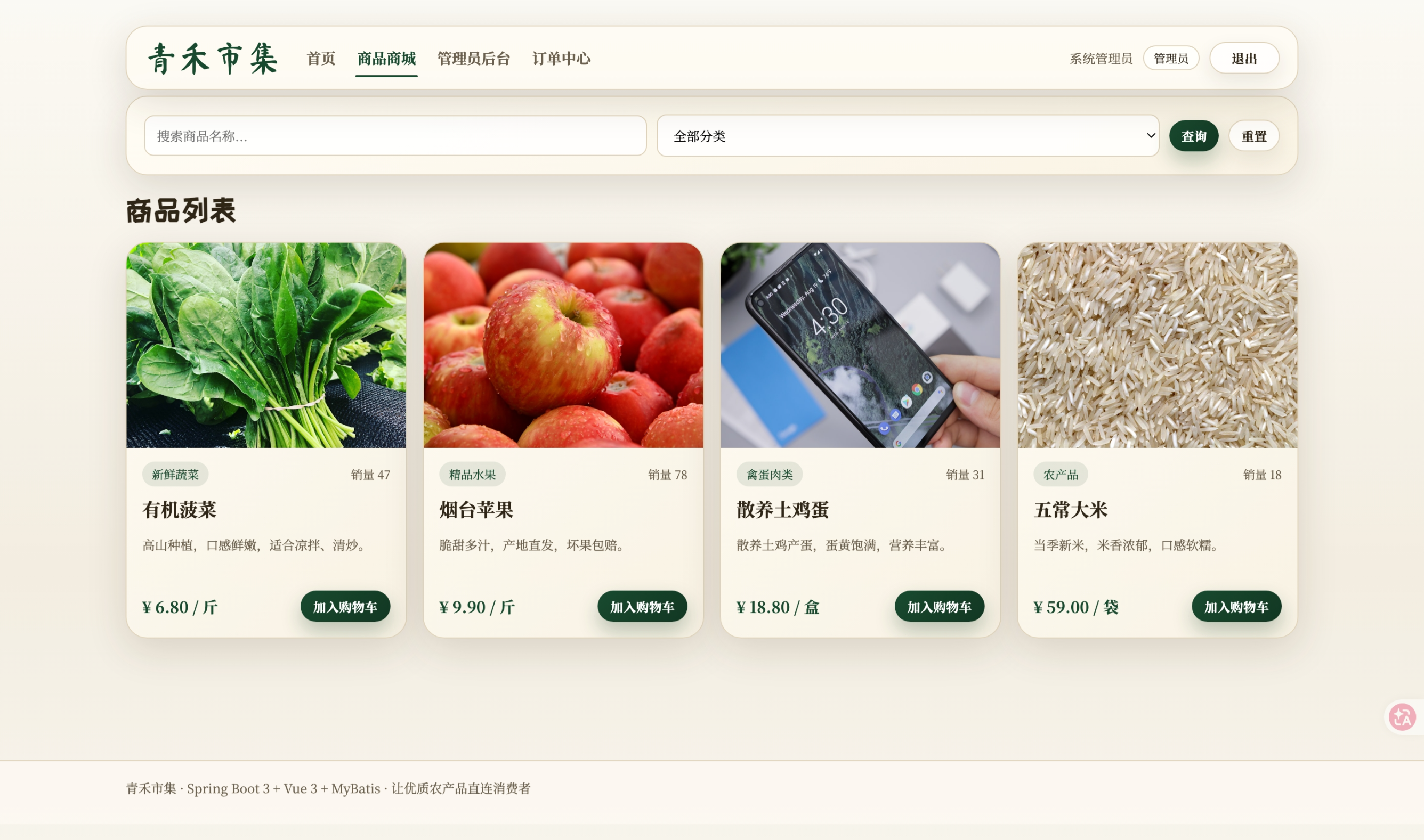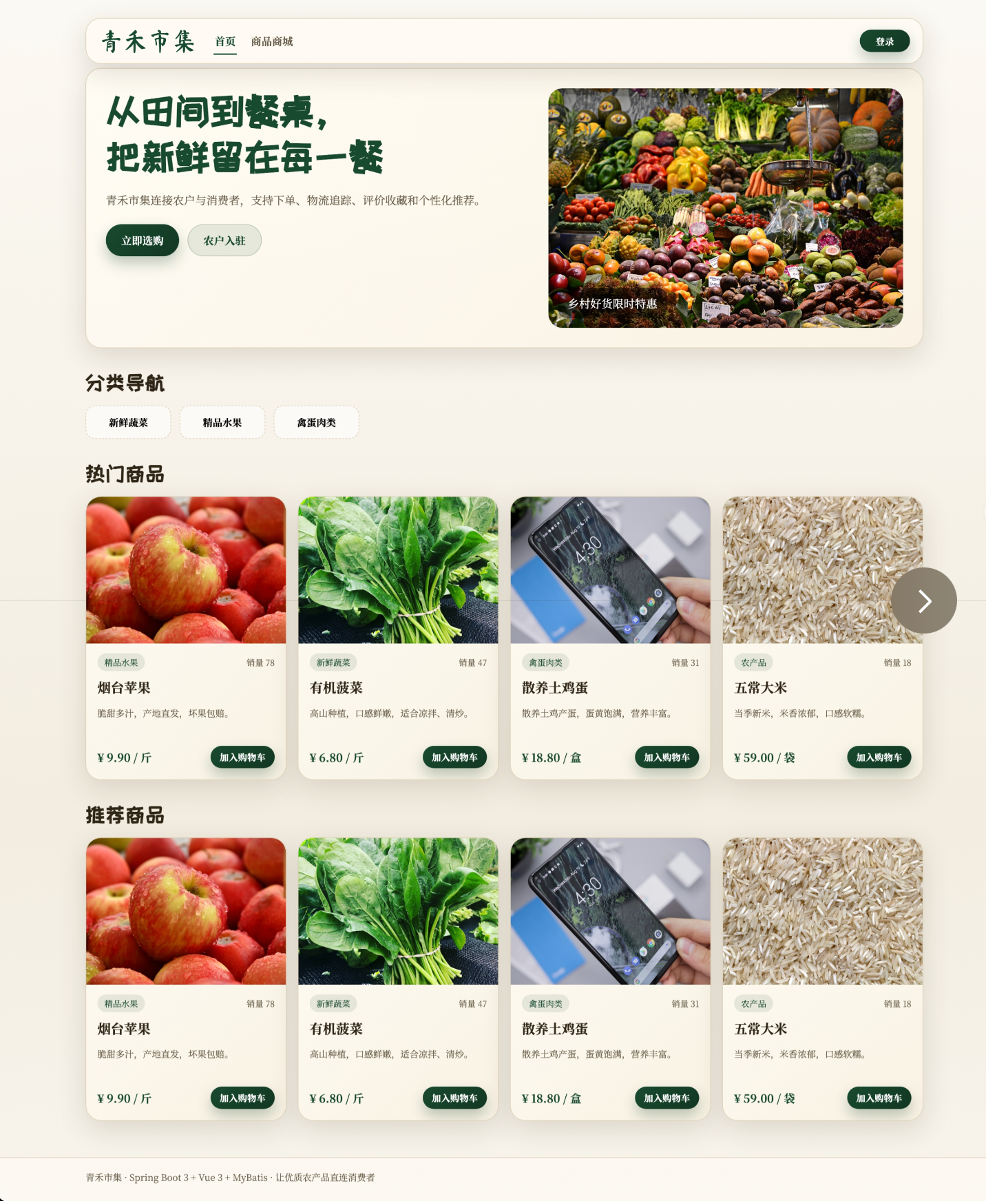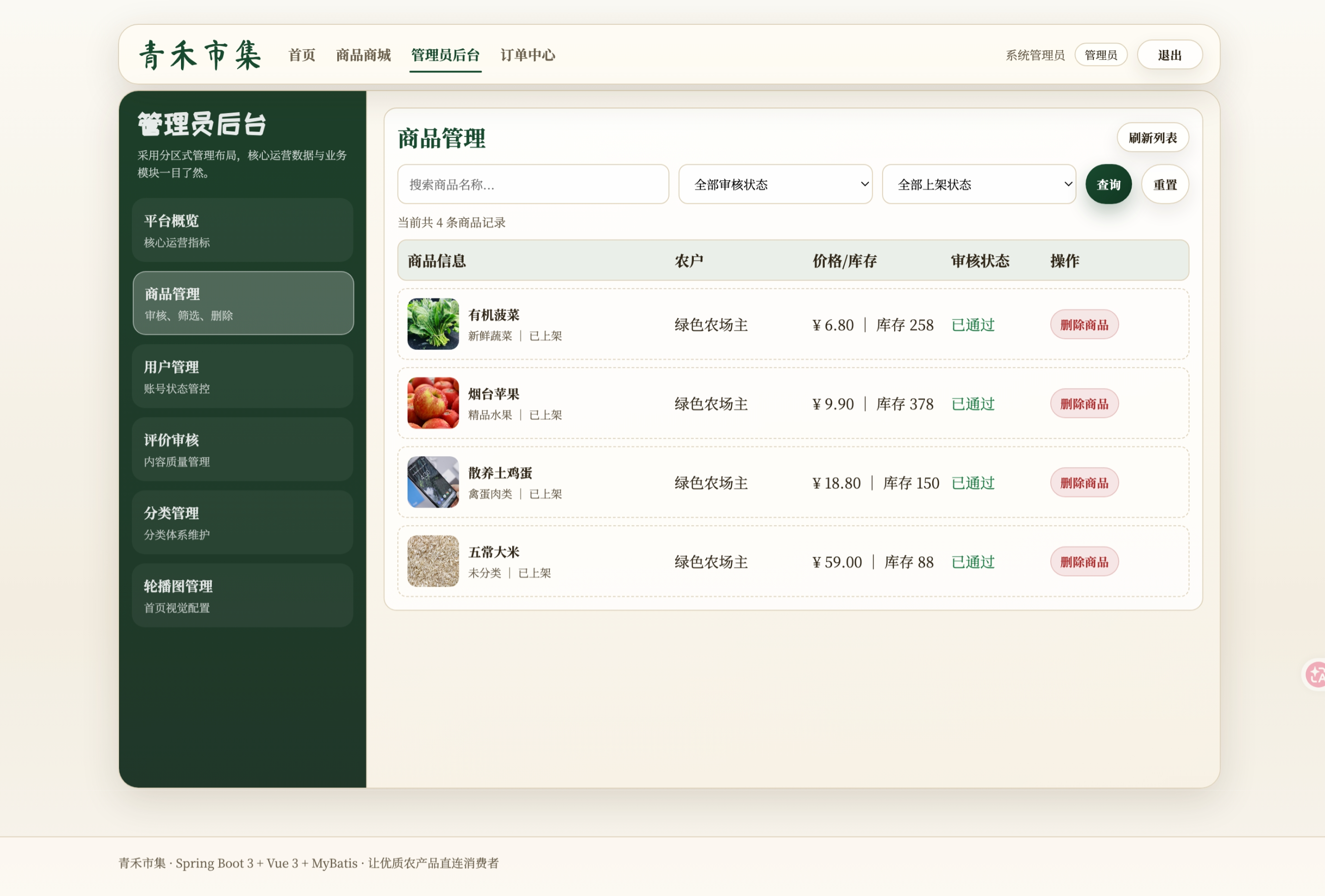 随着城乡供应链数字化进程的推进,农产品流通逐步从线下批发与熟人交易转向线上可追踪、可评价、可复购的电子商务模式。传统农产品销售在信息透明度、交易效率、履约协同与用户信任方面普遍存在短板,具体表现为:供需匹配效率低、订单履约状态不透明、售后评价机制薄弱、农户触达消费者能力不足。针对上述问题,本文围绕"农产品在线销售"场景,设计并实现了一个基于 Spring Boot 3 与 Vue 3 的前后端分离平台,通过多角色协同机制构建覆盖"商品发布---审核上架---下单支付---发货物流---评价反馈---运营管理"的闭环业务链路。