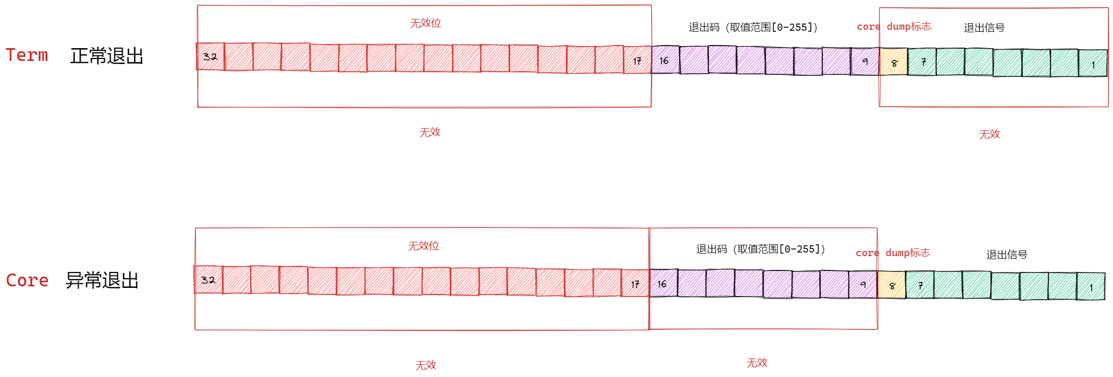 通过 core dump 标识识别正常退出和异常退出,0 为正常退出(Term),非 0 为异常退出(Core)