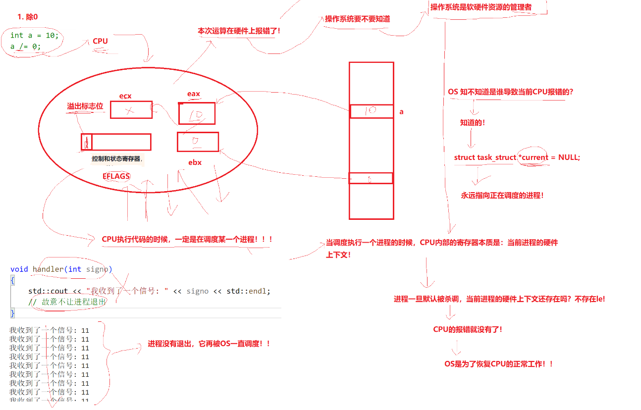 答;原因在于 除0,野指针 操作会被操作系统识别,然后给目标进程发送信号,进程在处理信号,默认终止了进程
