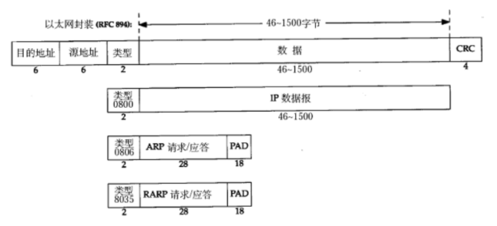 - 帧协议类型字段有三种值,分别对应IP、ARP、RARP;