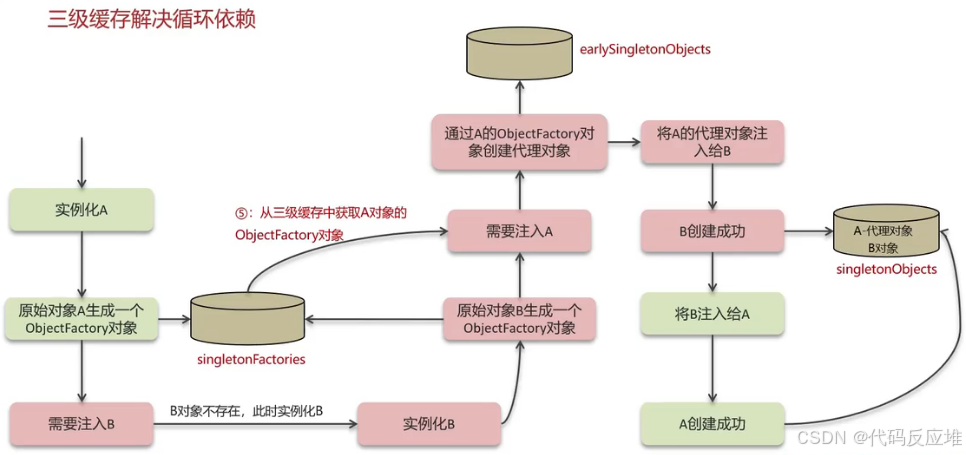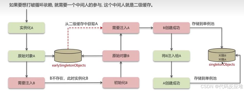 在Spring框架中,两个单例Bean互相依赖(即循环依赖)时,可以使用字段注入 (如@Autowired标注在字段上)或Setter注入 (如@Autowired标注在Setter方法上)来解决,Spring通过三级缓存 机制能够自动处理这种循环依赖。这种机制依赖于对象先实例化、后注入属性的顺序,因此字段注入和Setter注入都支持循环依赖。