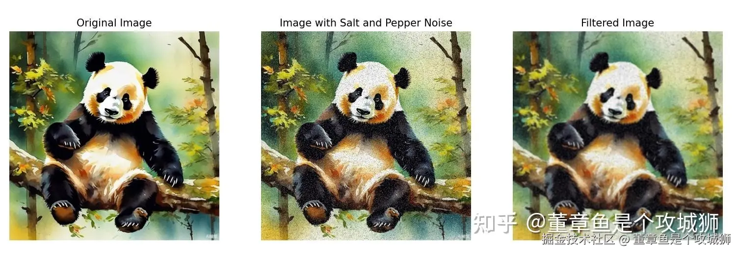 # 使用Matplotlib显示原始图像、椒盐噪声图像和滤波后的图像