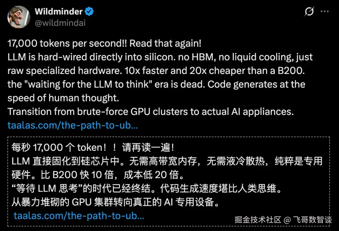 最近刷到一条挺"炸裂"的消息:多伦多一家初创公司 Taalas 做了一颗 HC1 芯片,宣称跑 Llama 3.1 8B 能到 17,000 tokens/秒。