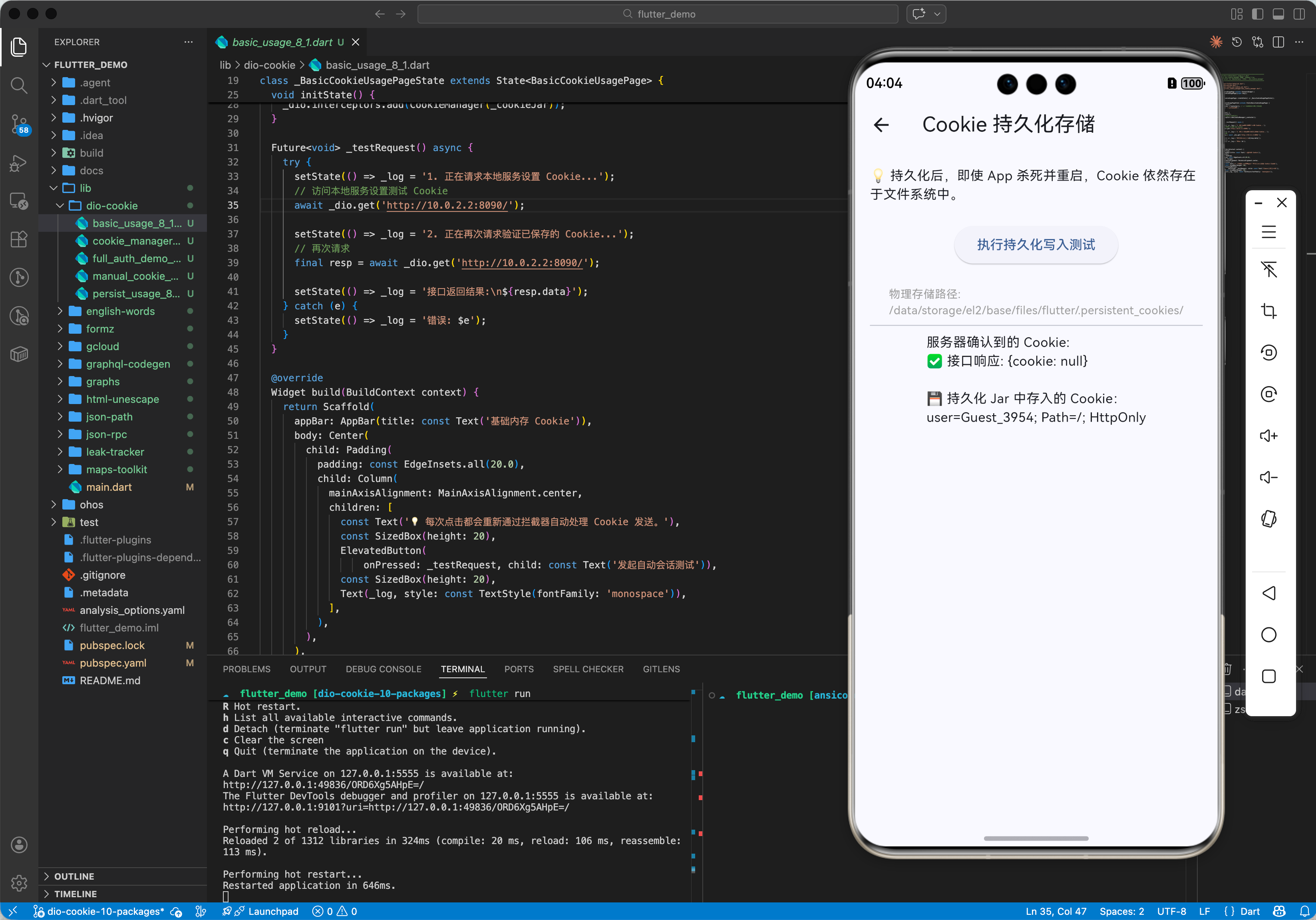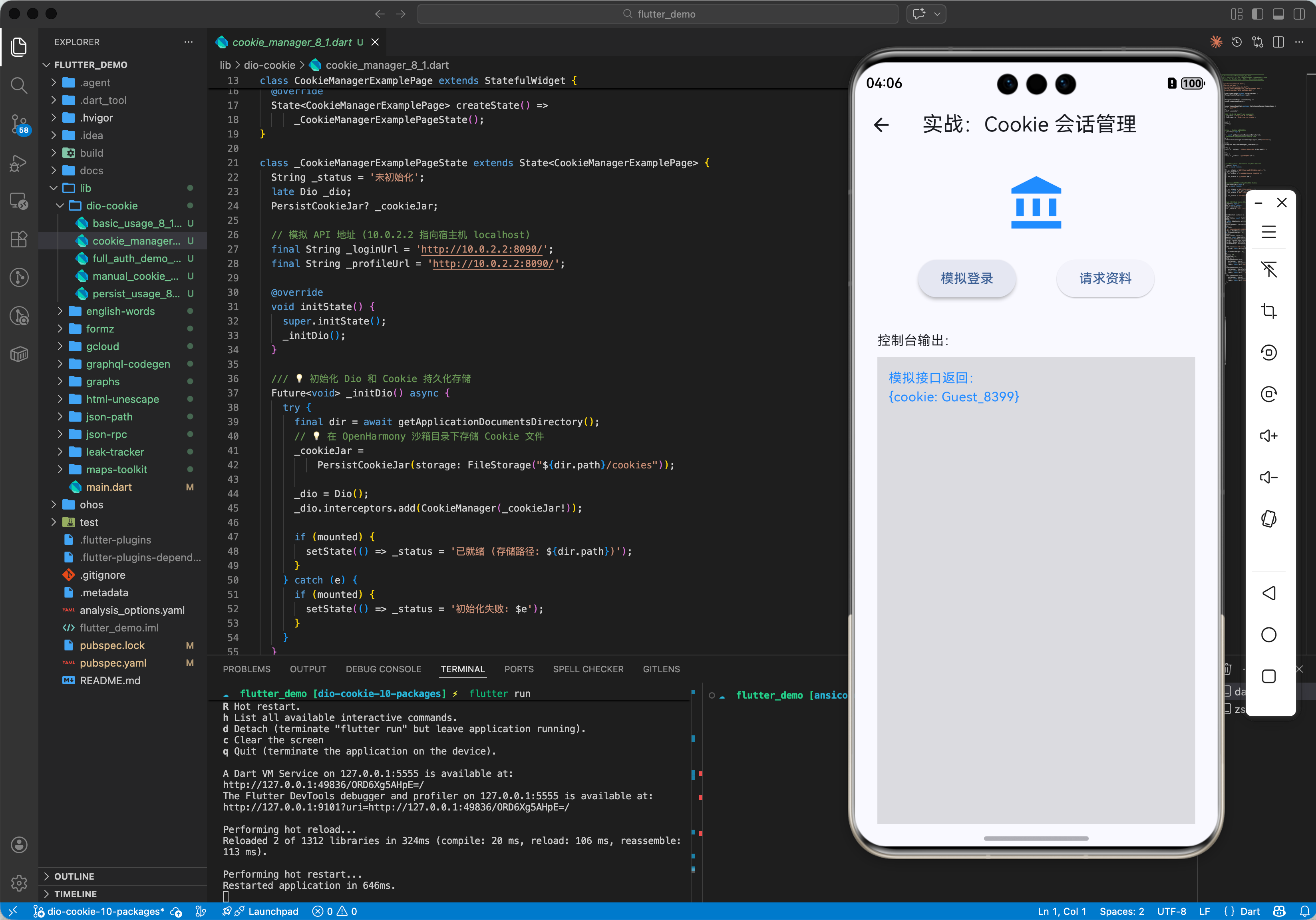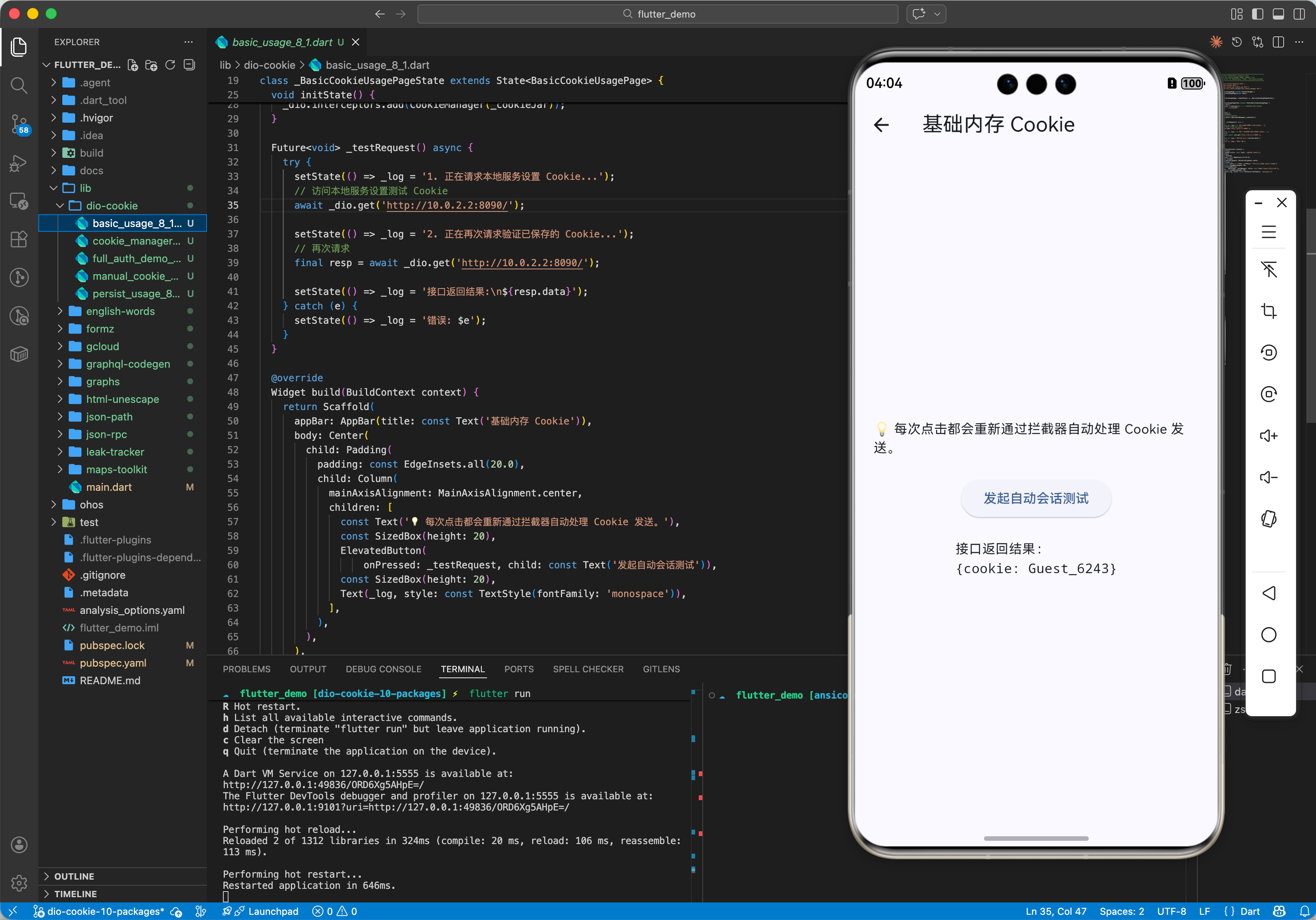 虽然 Dio 不是浏览器,不受同源策略限制,但鸿蒙系统的网络权限管理通过 module.json5 控制。如果 Cookie 中包含 HttpOnly,dio_cookie_manager 依然能处理(因为它是在 Dart 层模拟),但要注意不要将敏感 Cookie 打印到日志中。