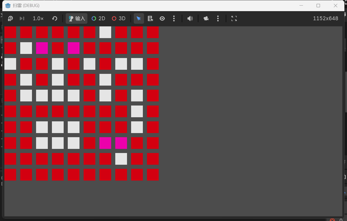 现在,我们点击运行游戏,可以看到有部分格子被翻开后变成了紫色,证明我们点到了雷: