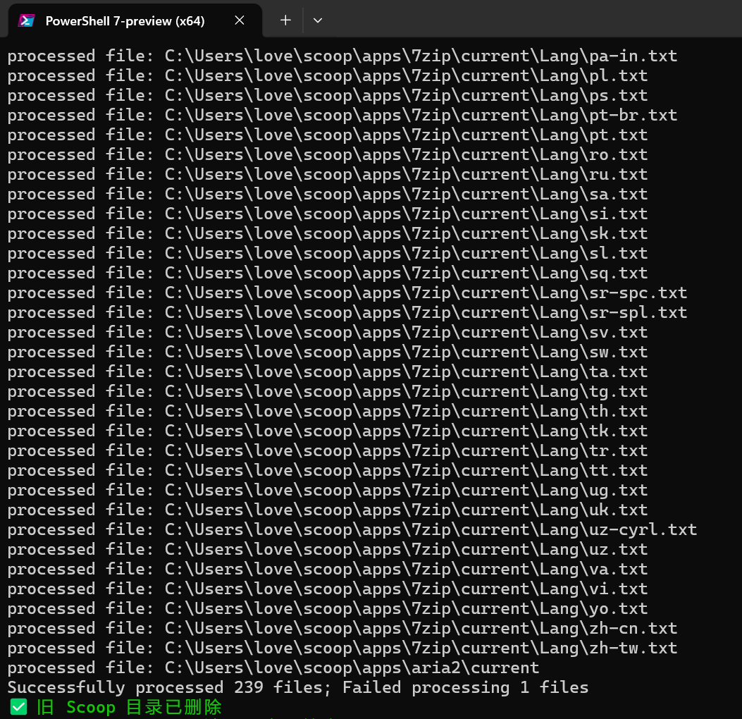 Write-Host "❌ 删除失败,请重启后手动删除: $oldScoopPath" -ForegroundColor Red