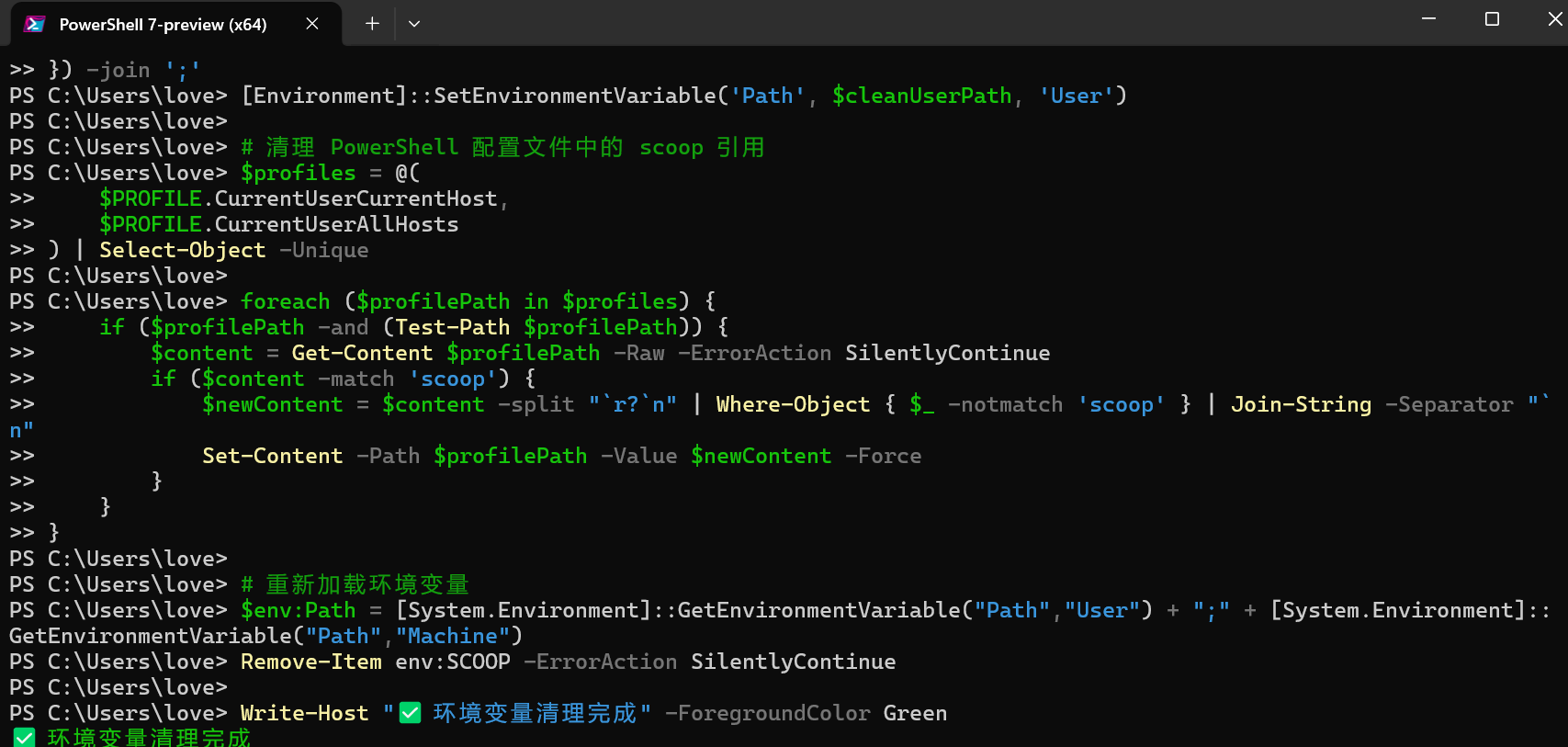 # 清理 PowerShell 配置文件中的 scoop 引用