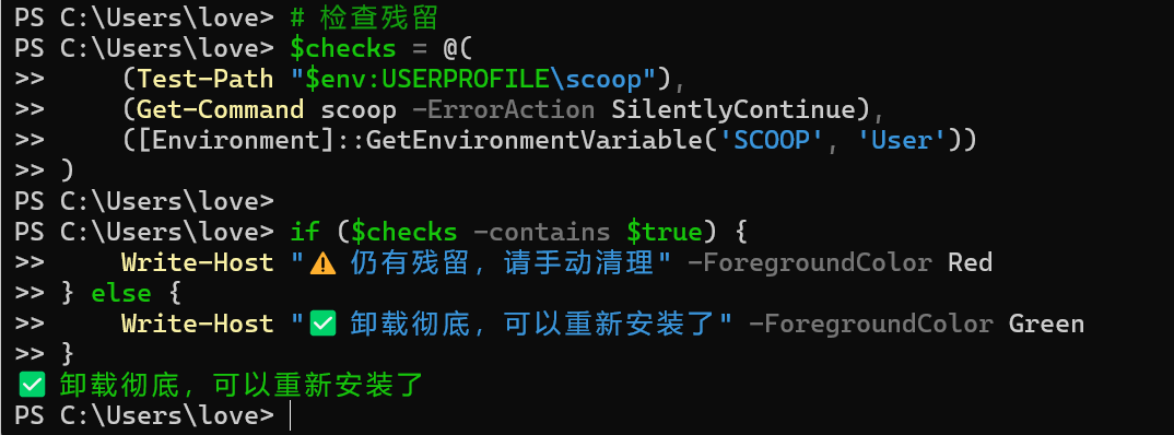 Write-Host "✅ 卸载彻底,可以重新安装了" -ForegroundColor Green