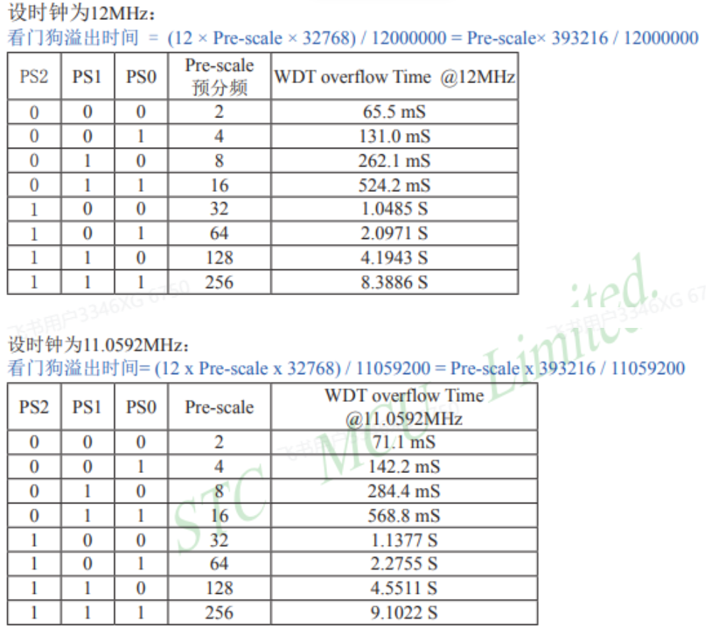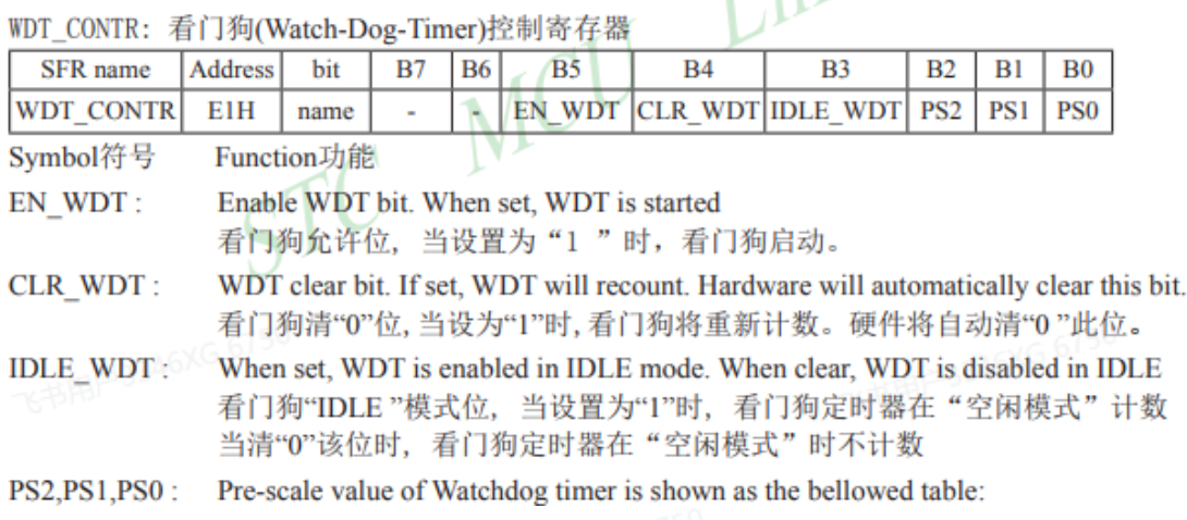 IDLE_WDT:设置为0,空闲模式不计数,我们设备工作时处于正常模式,可以通过寄存器设置进入掉电模式、空闲模式,以节省电量。