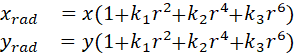 x rad =x 1 k 1 r 2 k 2 r 4 k 3 r 6 y rad =y 1 k 1 r 2 k 2 r 4 k 3 r6