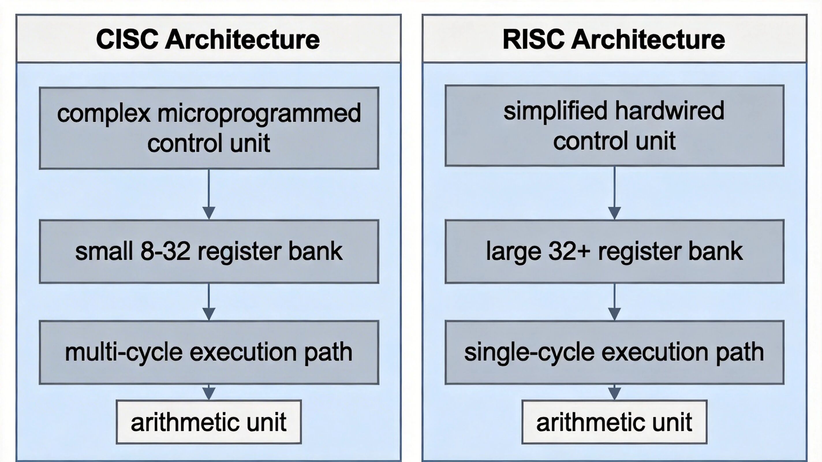 CISC 与 RISC 架构的内部实现逻辑对比图,包含控制单元、运算单元、寄存器组的结构差异展示
