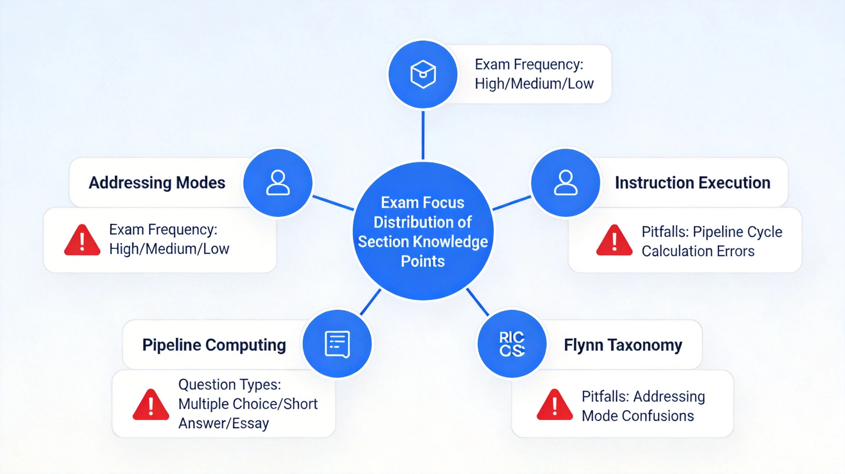 高频考点:寻址方式速度比较、CPU 区分指令数据的依据、CISC 与 RISC 的对比、流水线执行时间计算,以上内容每年必考,占本节分值的 80% 以上。