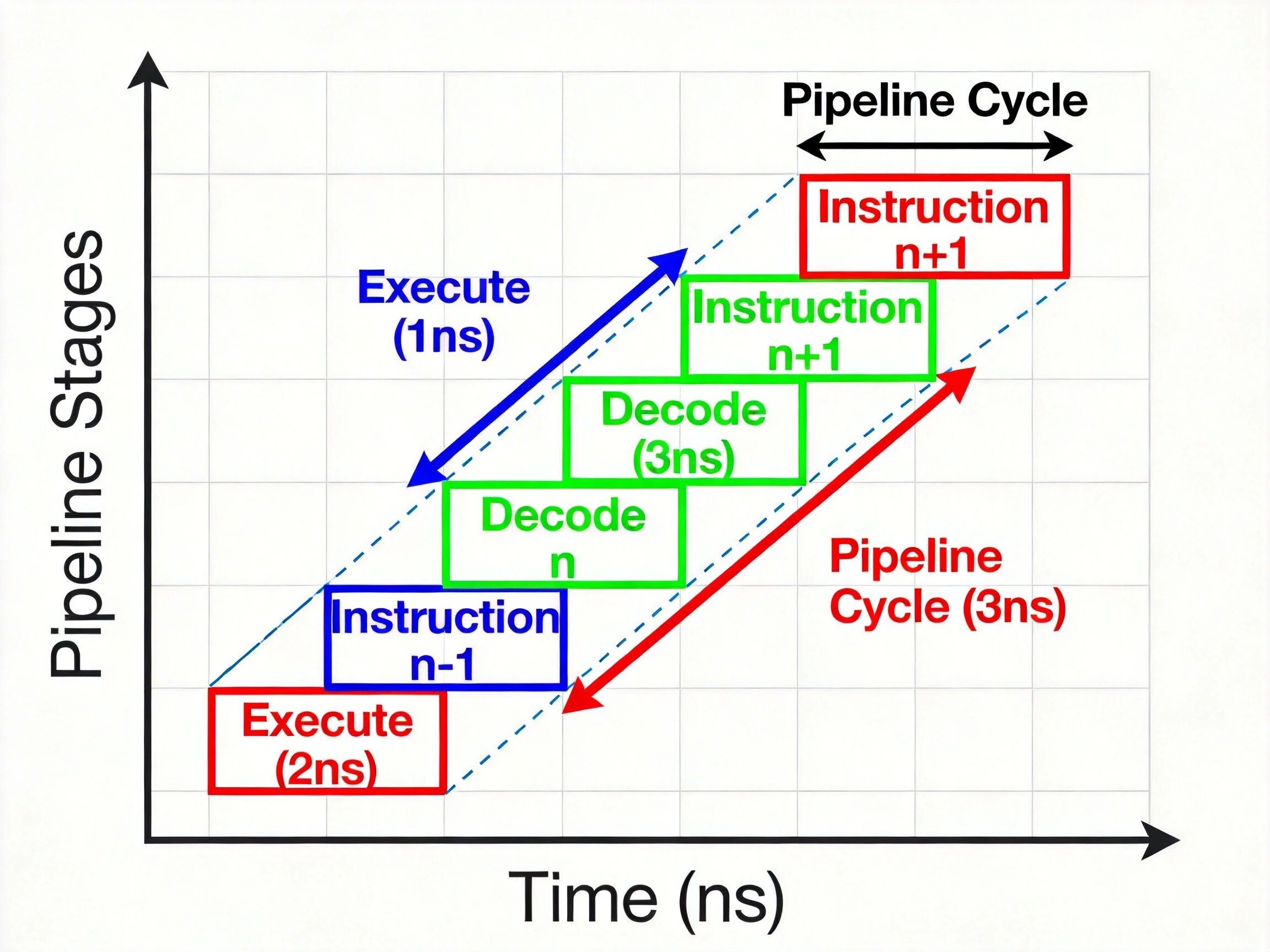 流水线执行时间 :T = 第一条指令执行时间 + (指令条数 - 1) × 流水线周期。其中流水线周期为所有执行阶段中耗时最长的阶段的时间。