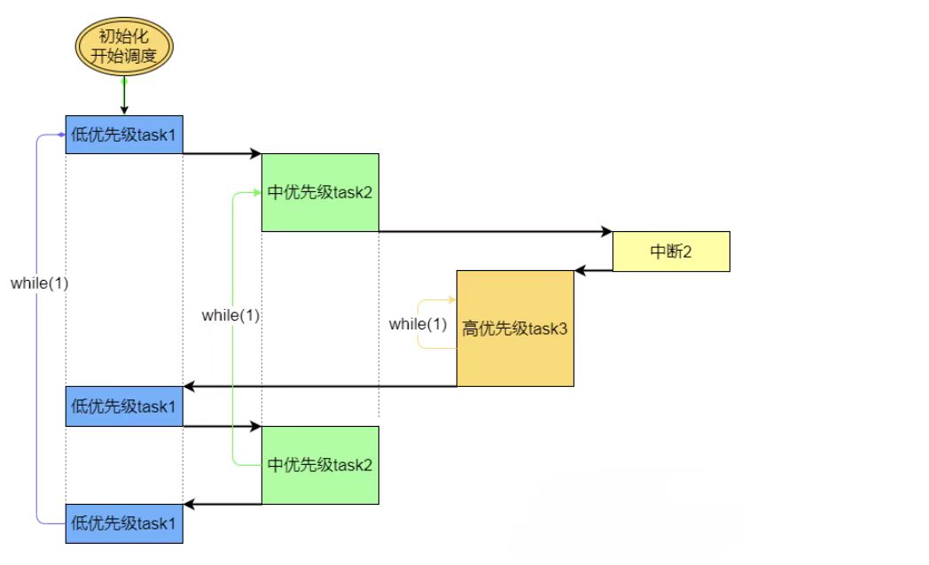 run_task_3执行耗时 1 分钟,即使中断 1 触发,run_task_1也需等任务 3 执行完毕才能响应; -