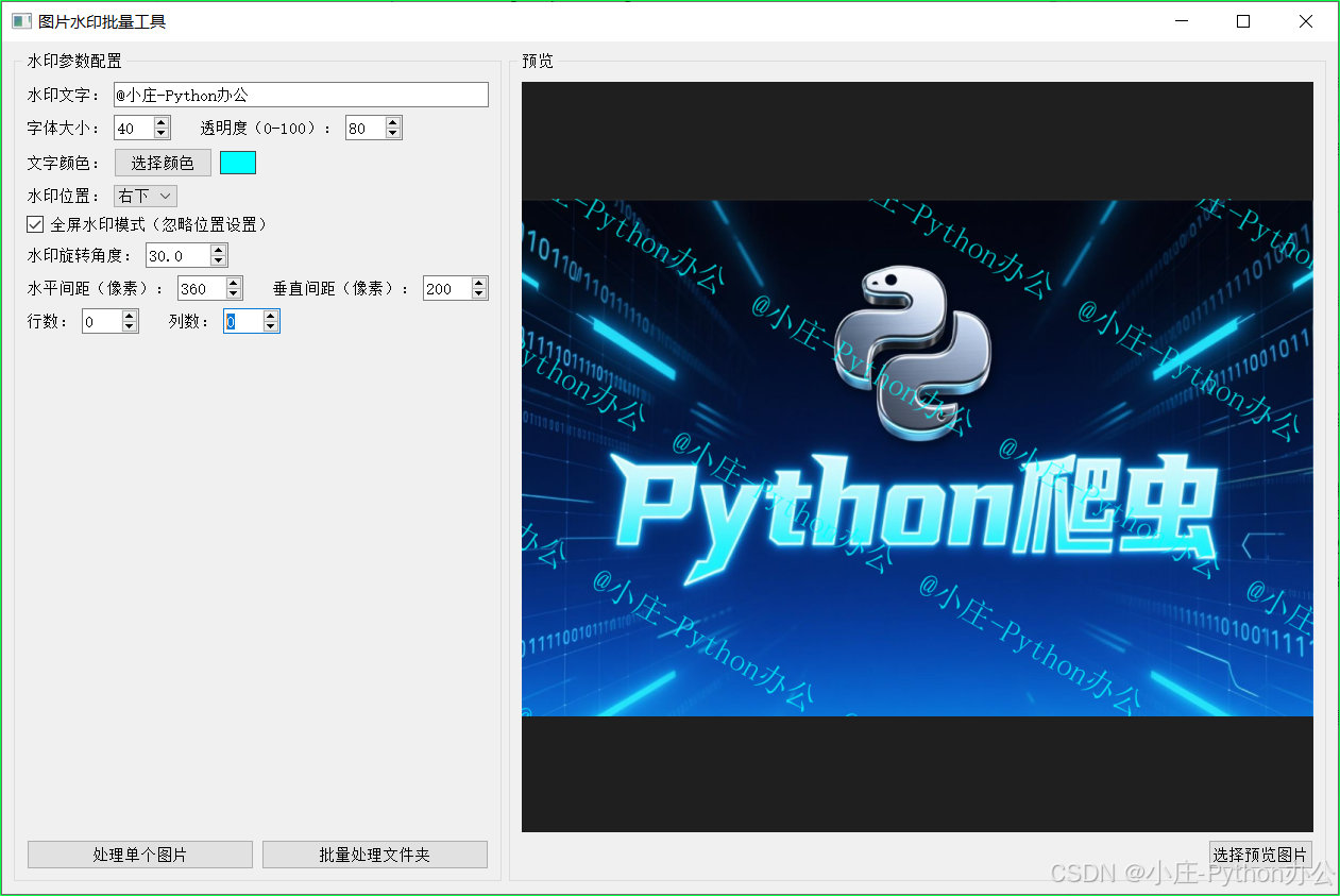 这篇文章完整记录一个「批量图片添加水印」桌面工具的研发过程:左侧配置水印参数,右侧实时预览效果,支持单张处理与文件夹批量处理,适合用作 PyQt5 入门到实战的小项目。