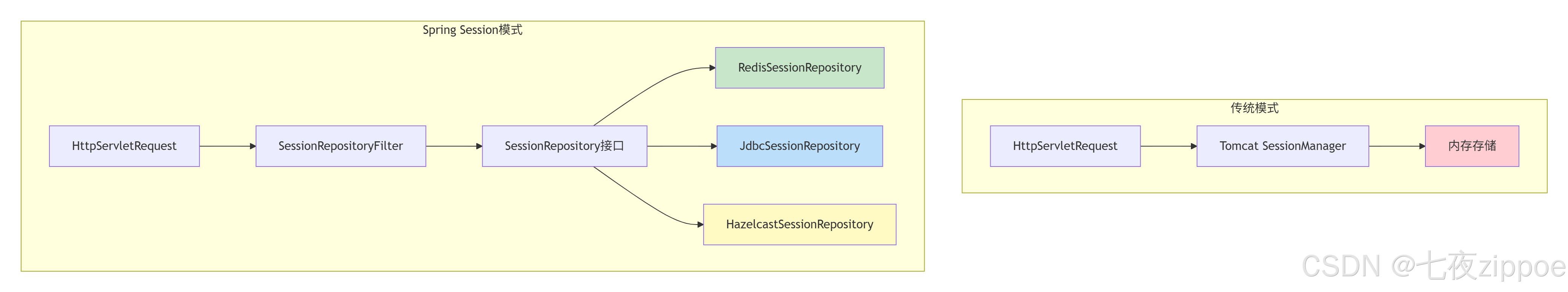 Spring Session的核心思想是会话存储与容器解耦。它通过拦截器模式,在Servlet容器层面替换默认的会话管理器,实现存储后端的无缝切换。