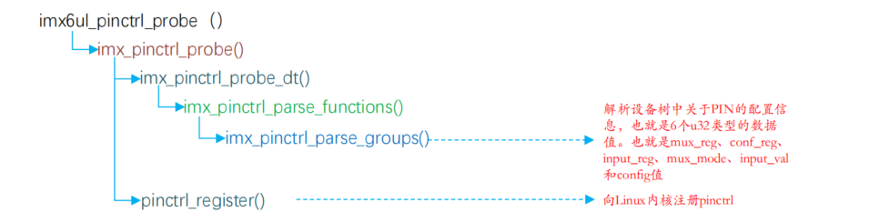 前文我们已在设备树中完成了 PIN 的配置,而真正将这些配置转化为硬件寄存器操作的,是 Linux 内核中的 pinctrl 驱动。本小节仅梳理核心执行流程,帮助大家理解 "设备树配置如何被内核析"。