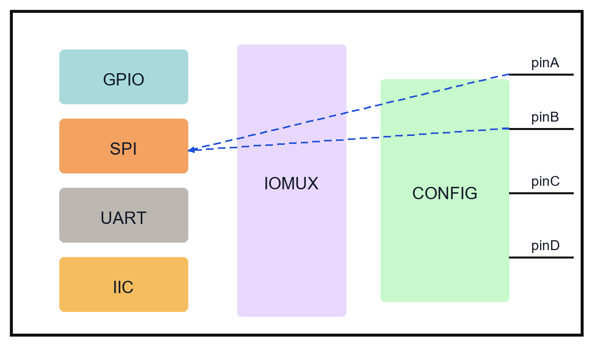 如果我们想让pinA和pinB用于SPI功能,需要设置IOMUX,配置这两个引脚连接到SPI模块。