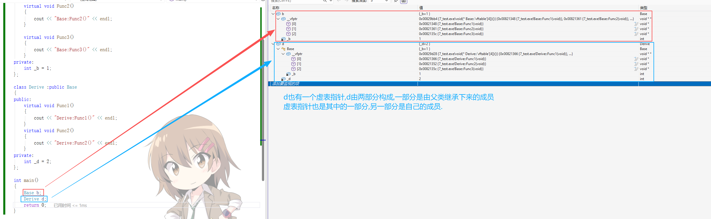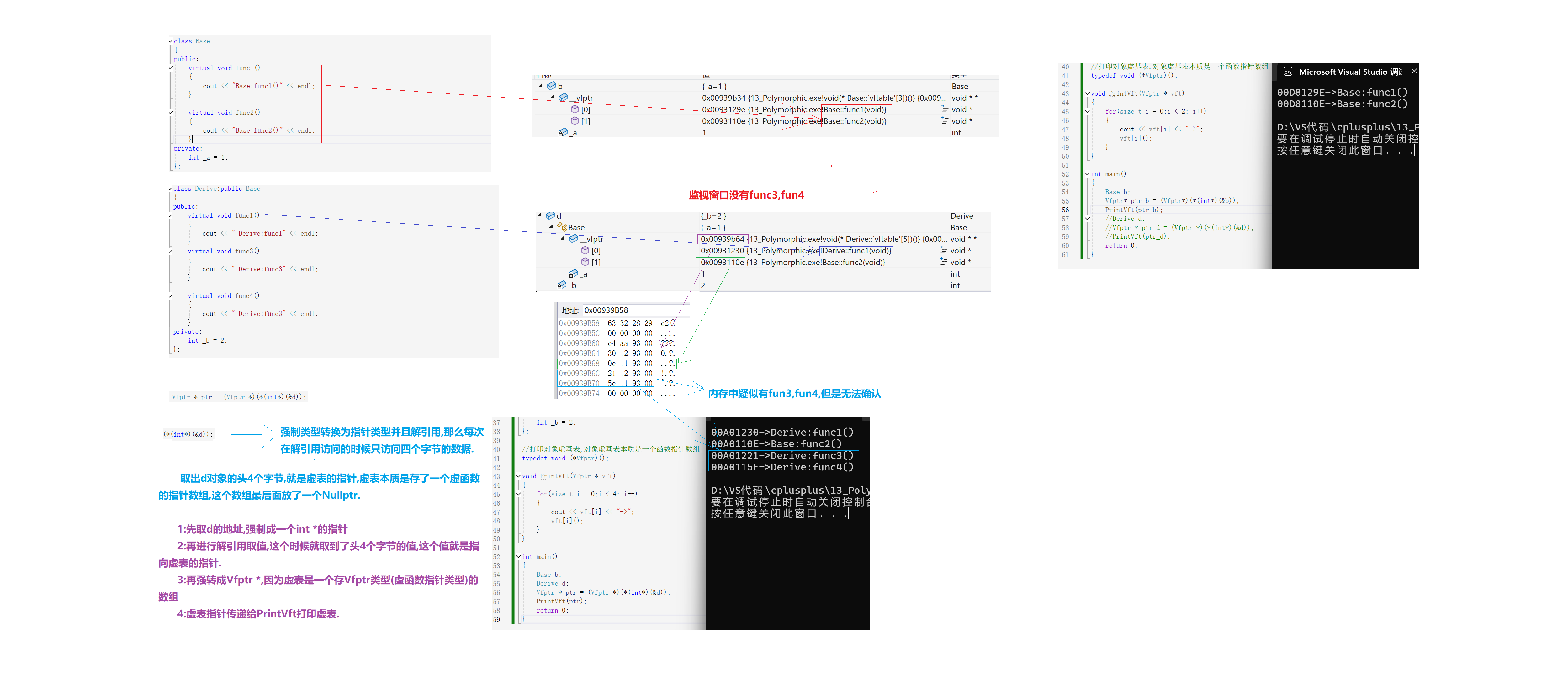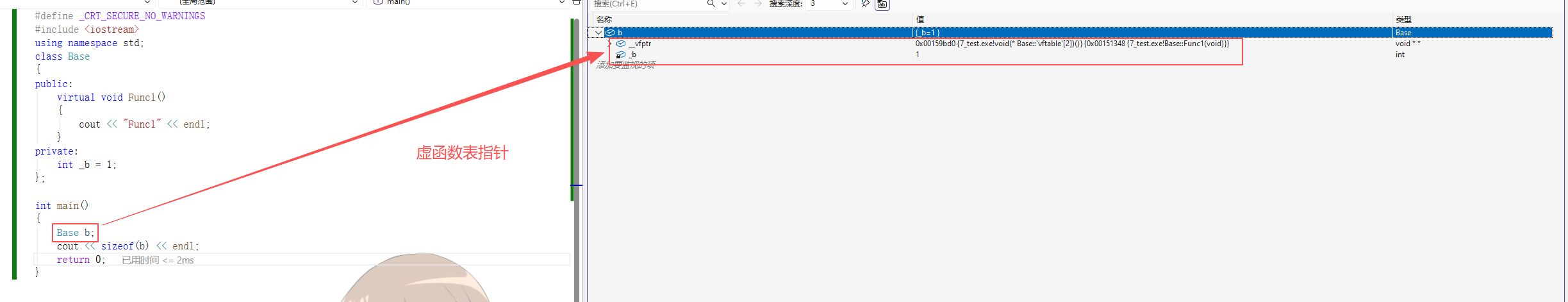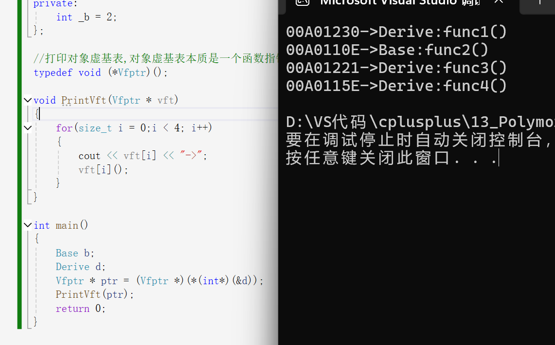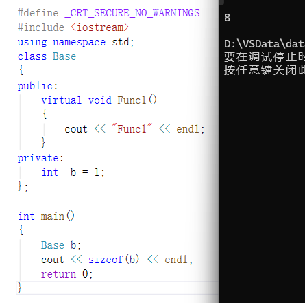 通过测试可以发现b对象是8字节.**除了_b成员,还多了一个_vfptr放在对象的前面(有些平台可能会放到对象的最后面,这个跟平台有关系),对象中的这个指针叫做虚函数指针表(v代表virtual,f代表function).**一个含有虚函数的类中至少都有一个虚函数表指针,因为虚函数的地址要被放到虚函数表中,虚函数表也简称虚表.