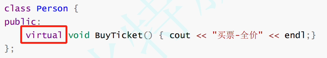 virtual void BuyTicket() { cout << "买票-全价" << endl;}