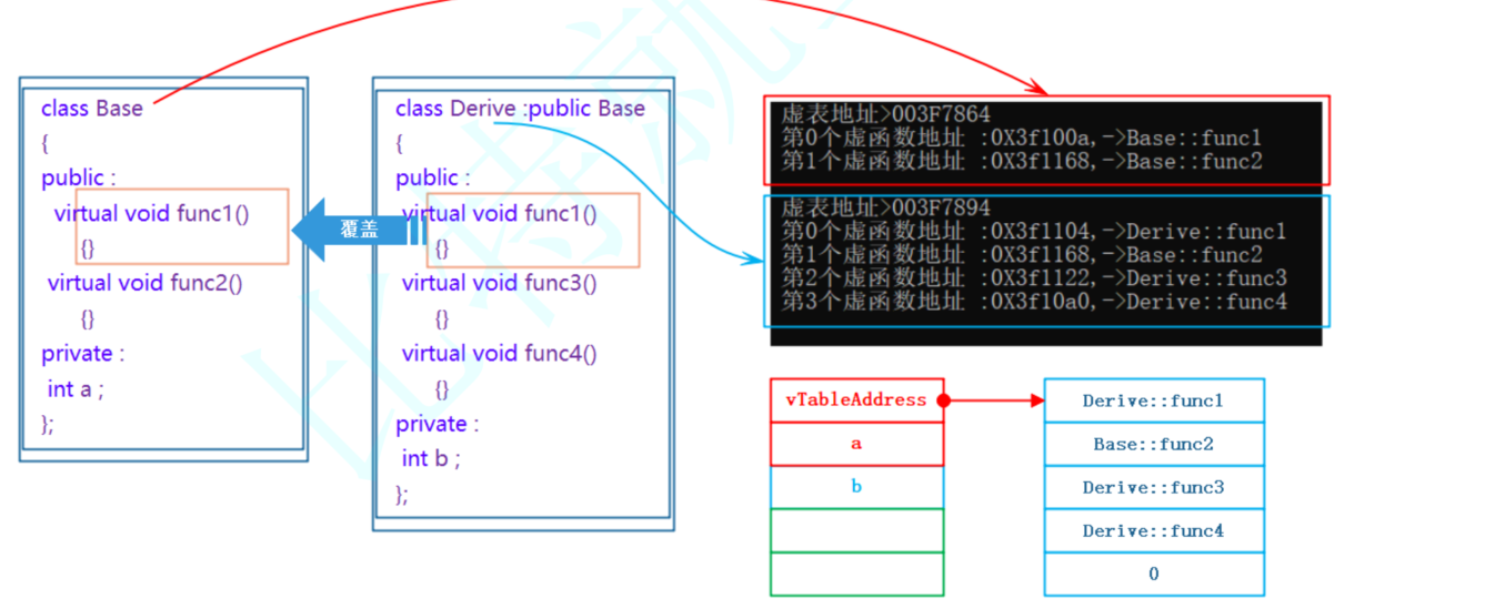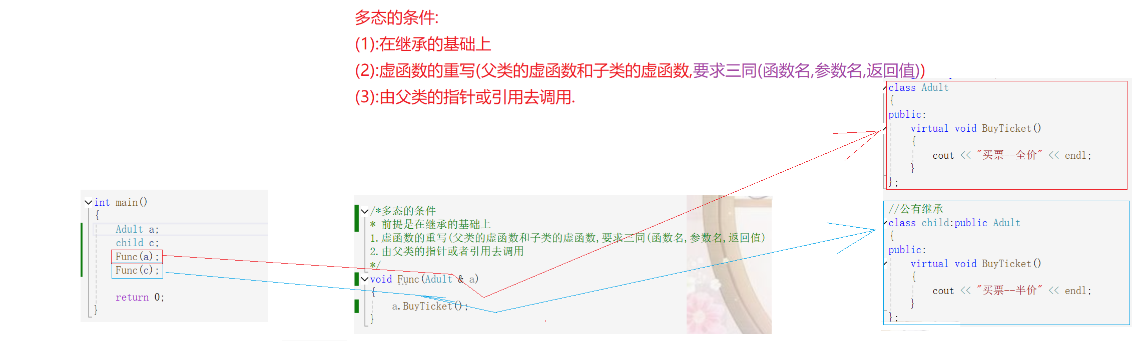 - 2.被调用的函数必须是虚函数,且派生类对基类的虚函数进行重写.