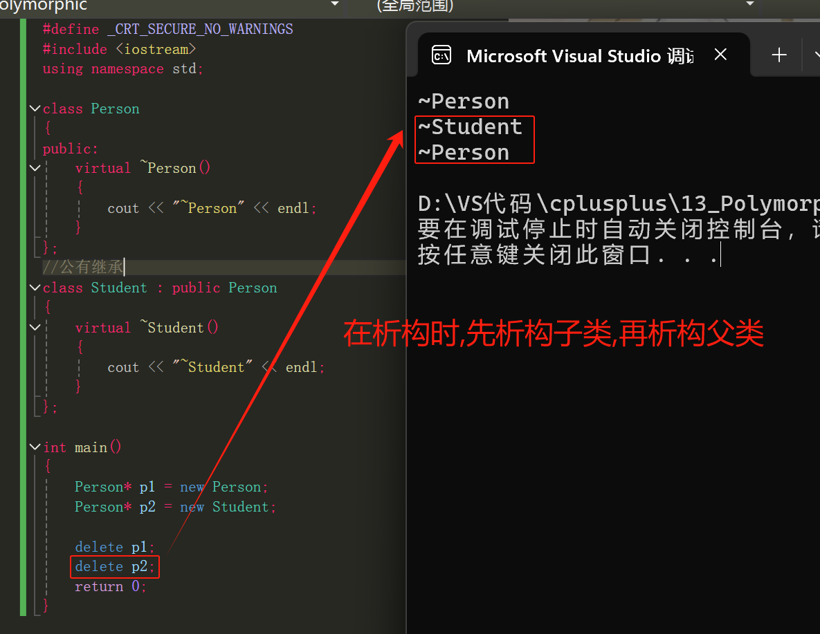如果基类的析构函数为虚函数,此时派生类析构函数只要定义,无论是否加virtual关键字,都与基类的析构函数构成重写 ,虽然基类与派生类析构函数名字不同.虽然函数名不相同,起来违背了重写的规则,其实不然,这里可以理解为编译器对析构函数的名称做了特殊处理,编译后析构函数的名称统一处理称destructor.