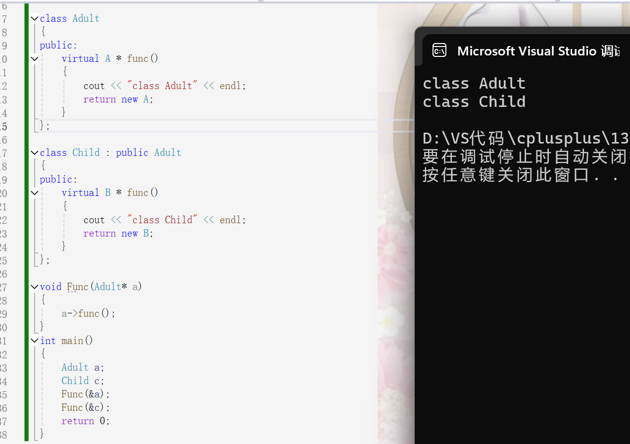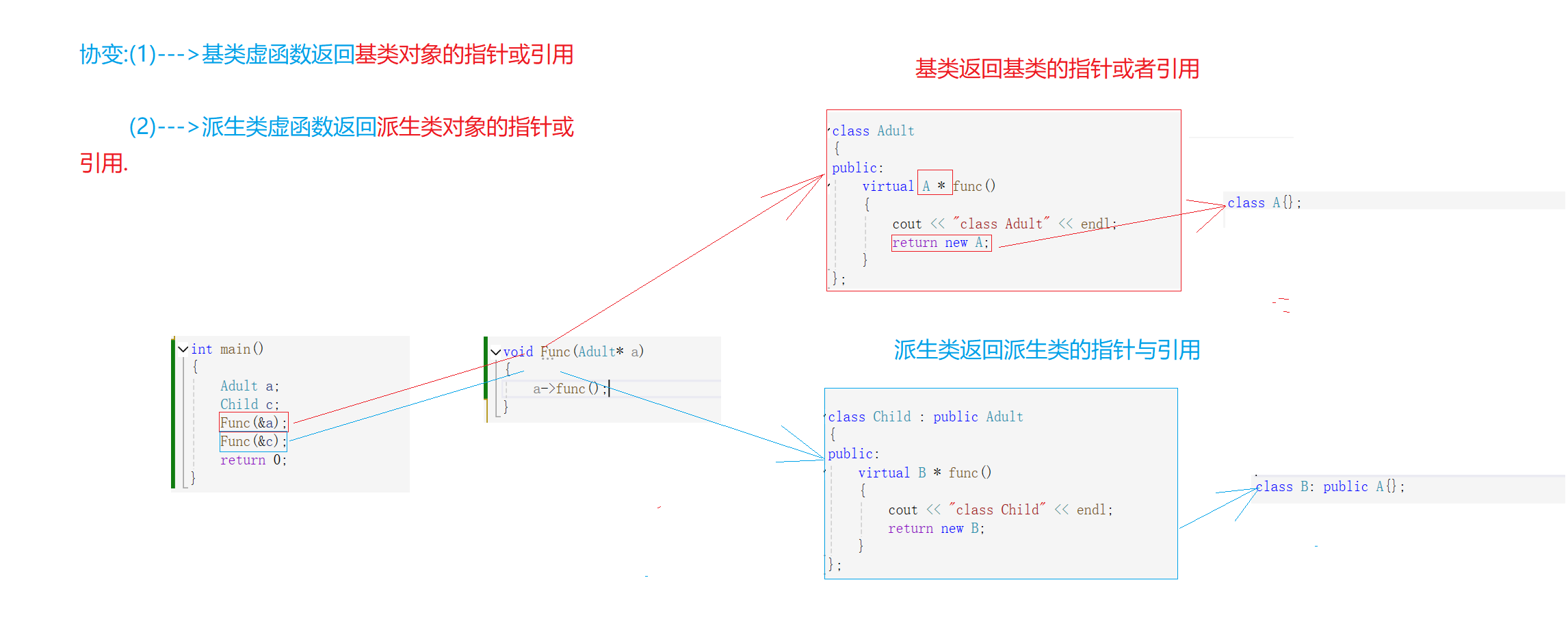 派生类重写类虚函数时,与基类虚函数返回值类型不同,即基类虚函数返回基类对象的指针或引用, 派生类虚函数返回派生类对象的指针或者引用时.