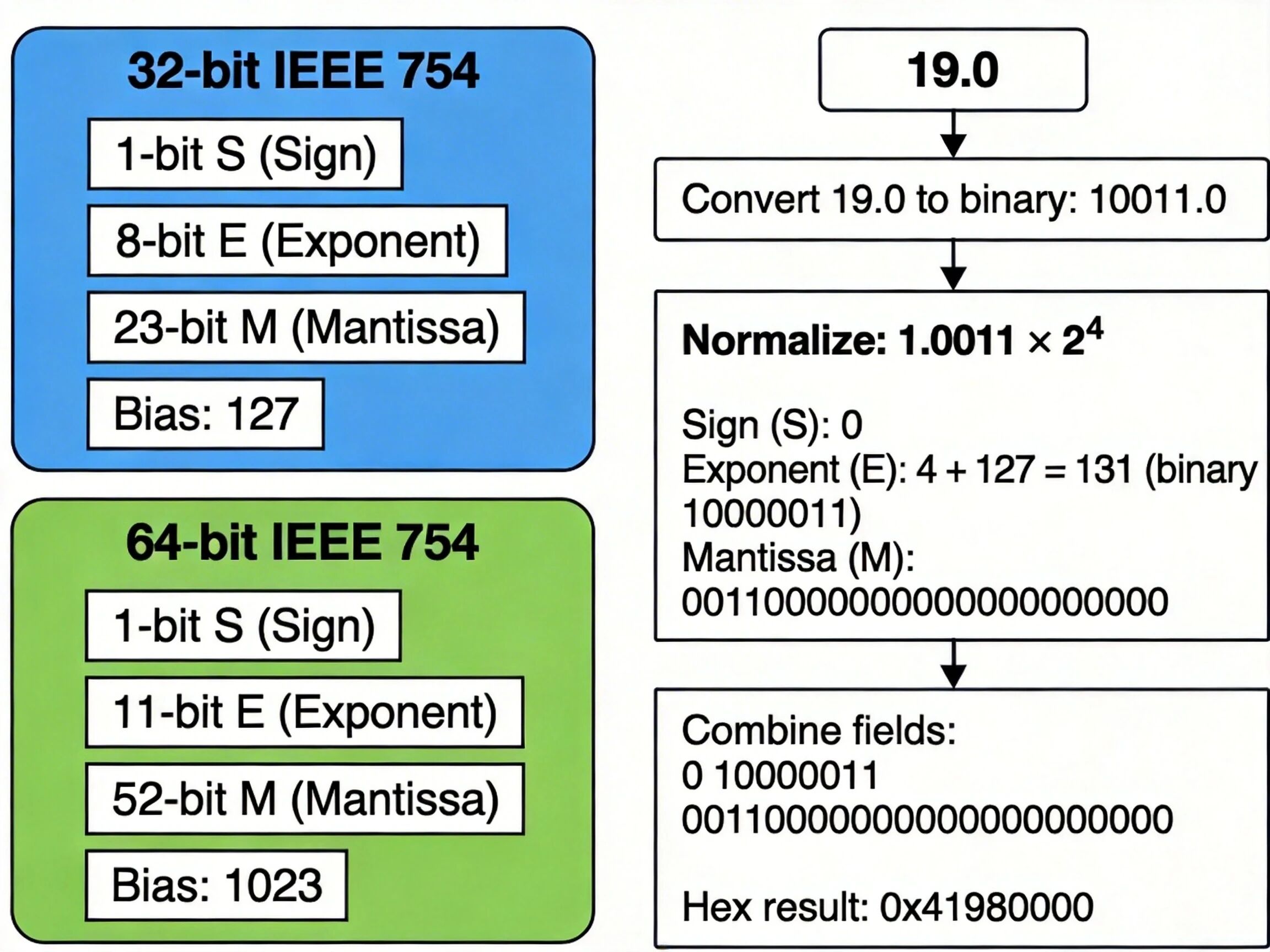 第一步,将 19.0 转换为二进制:10011.0 = 1.0011 × 2^4;