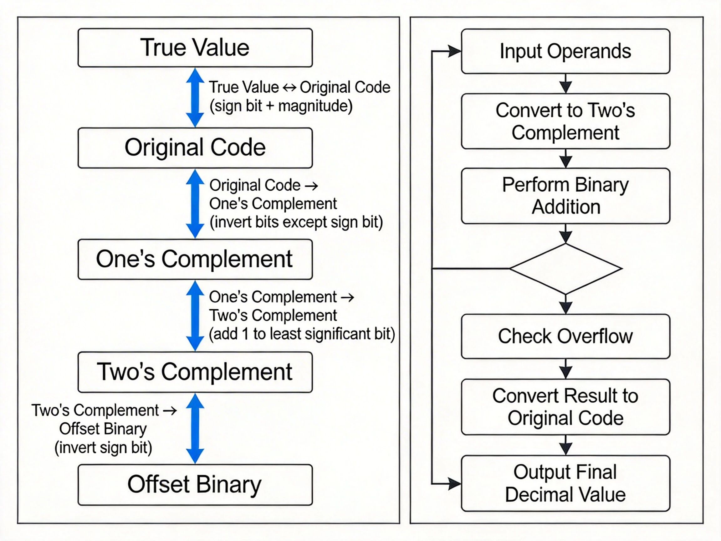 四种编码转换关系图、补码加减运算流程图