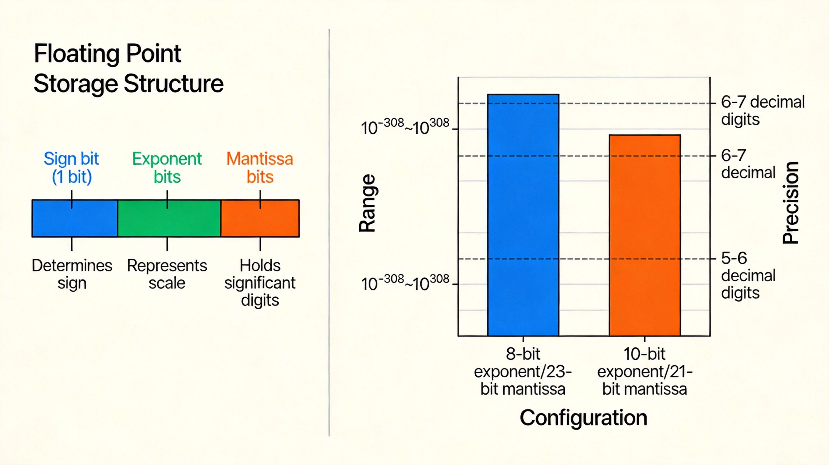 浮点数的总位数固定时,阶码位数越多,可表示的数值范围越大,但尾数位数减少,精度降低;反之阶码位数越少,范围越小但精度越高。例如 32 位浮点数若阶码占 8 位、尾数占 23 位,可表示范围约为 10^-38 ~ 10^38,精度约为十进制 6-7 位有效数字;若调整为阶码占 10 位、尾数占 21 位,范围可提升至 10^-308 ~ 10^308,但精度下降至 5-6 位有效数字。
