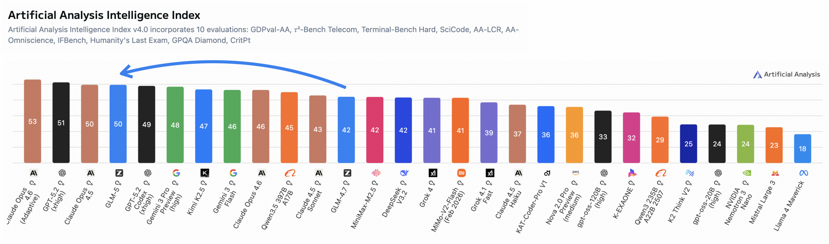 图解:Artificial Analysis Intelligence Index v4.0,GLM-5 进入 open-weight 最高分区间。