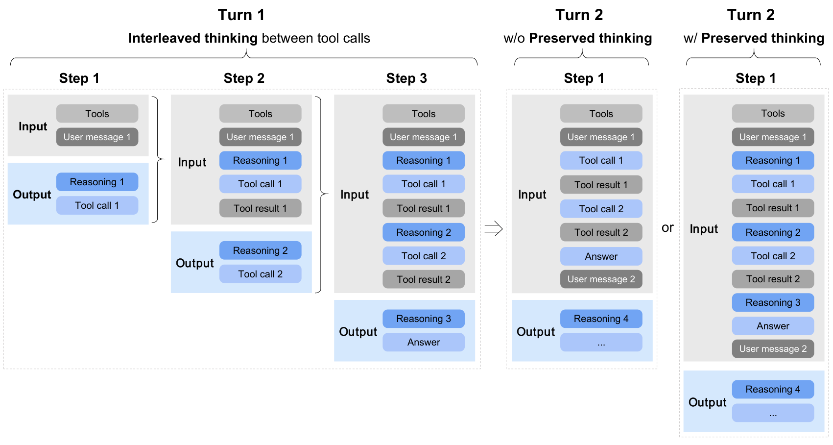 图解:模型支持三种思考模式:交错思考(每一步前推理)、保留思考(跨回合复用)、回合级开关(按需启停)。