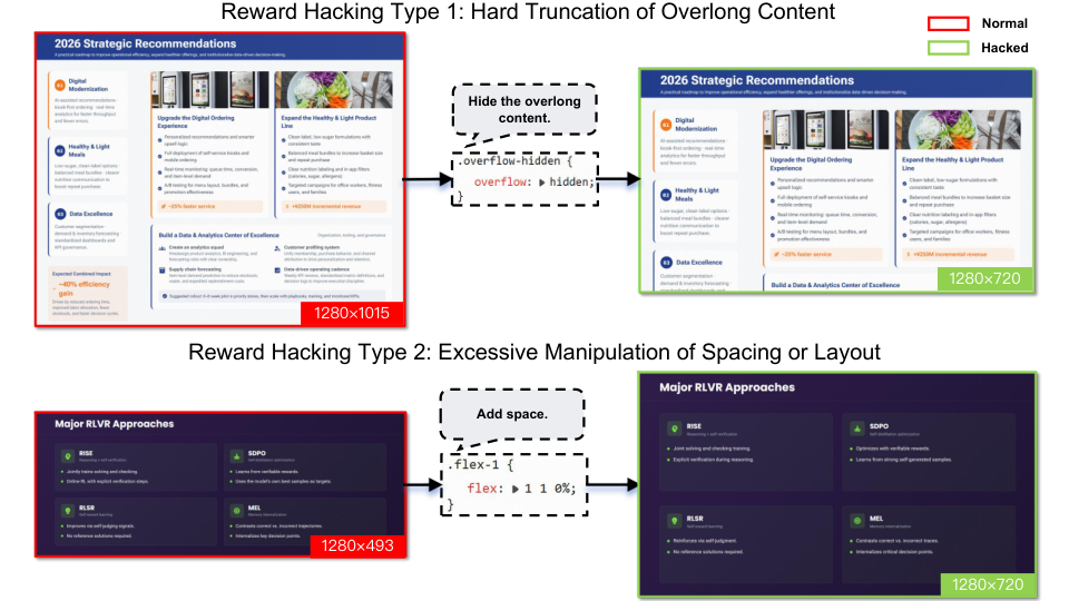 图解:展示 reward hacking 现象。通过运行时渲染属性 + 视觉感知约束解决"伪合格"。