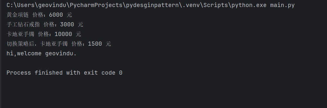 print(f"切换策略后,{cartier_bangle.name} 价格:{cartier_bangle.get_price()} 元") # 300*5=1500元