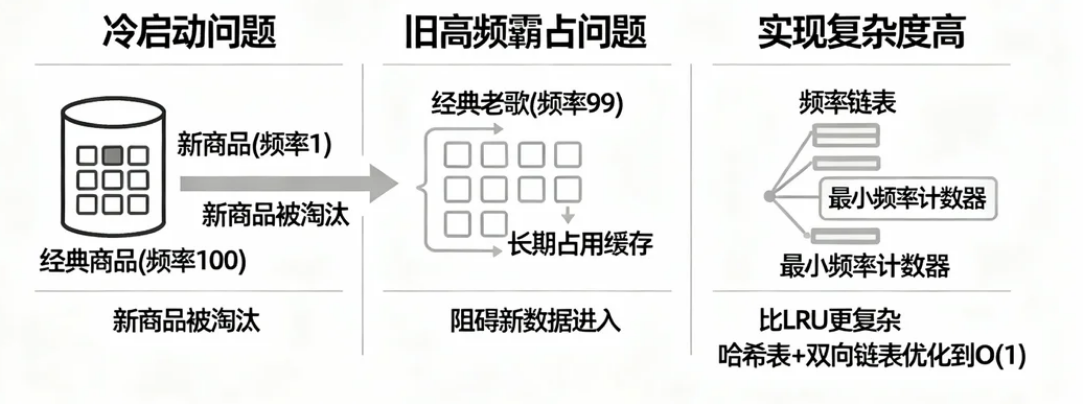 - 旧高频霸占问题:历史高频但当前不再使用的数据(如过季商品、旧闻)可能因早期积累的高频率长期占位,阻碍新热点数据的缓存(例如:经典老歌长期占缓存,新歌难进入)。