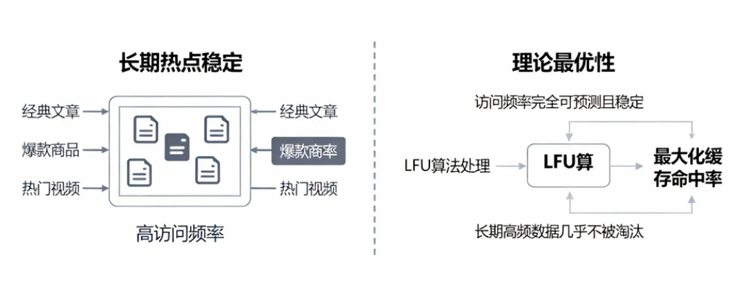 - 理论最优性:在"访问频率完全可预测且稳定"的场景下,LFU能最大化缓存命中率(长期高频数据几乎不被淘汰)。